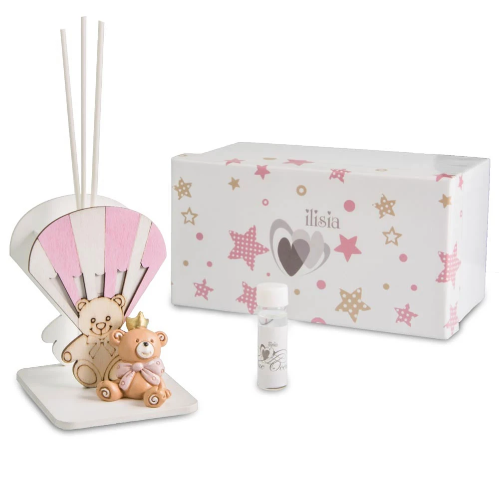 Bomboniere Battesimo e Nascita per Bimba Originali, profumatore e lampada led a forma di mongolfiera con orsetto rosa in resina decorata a mano,compreso di scatola.