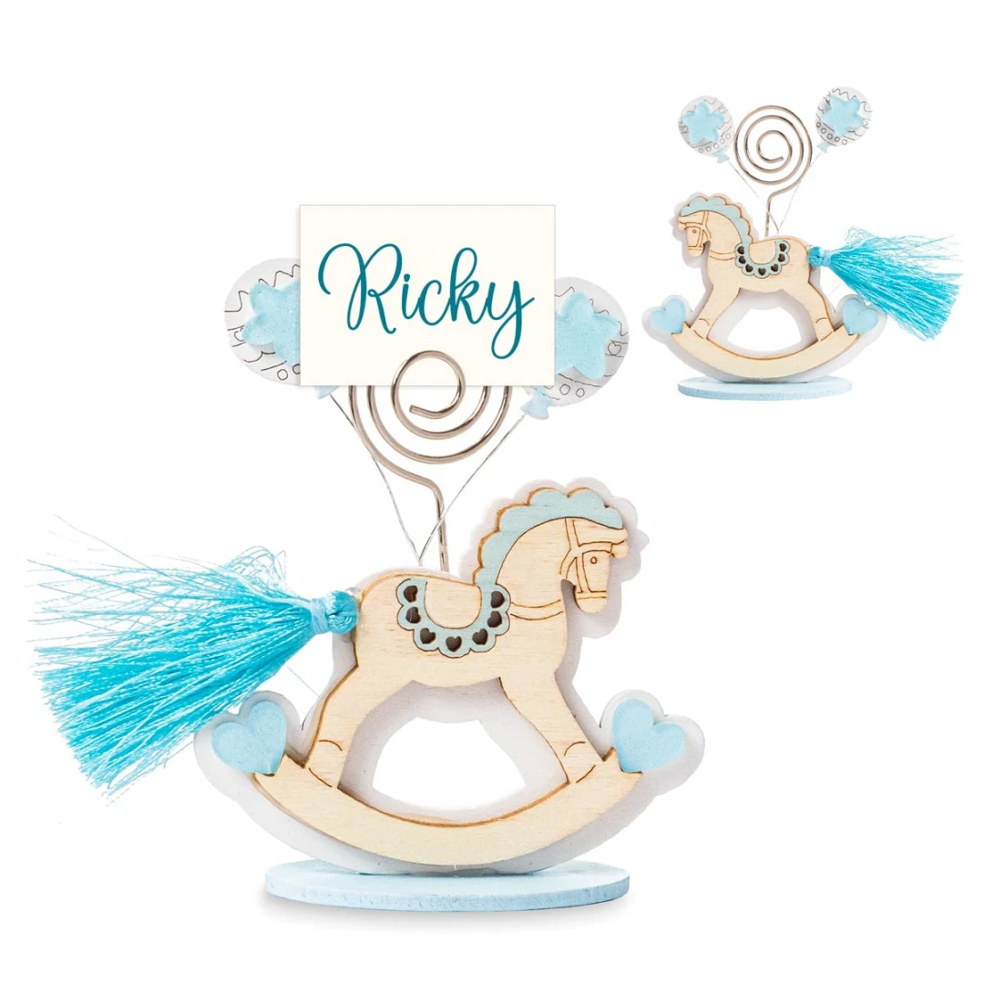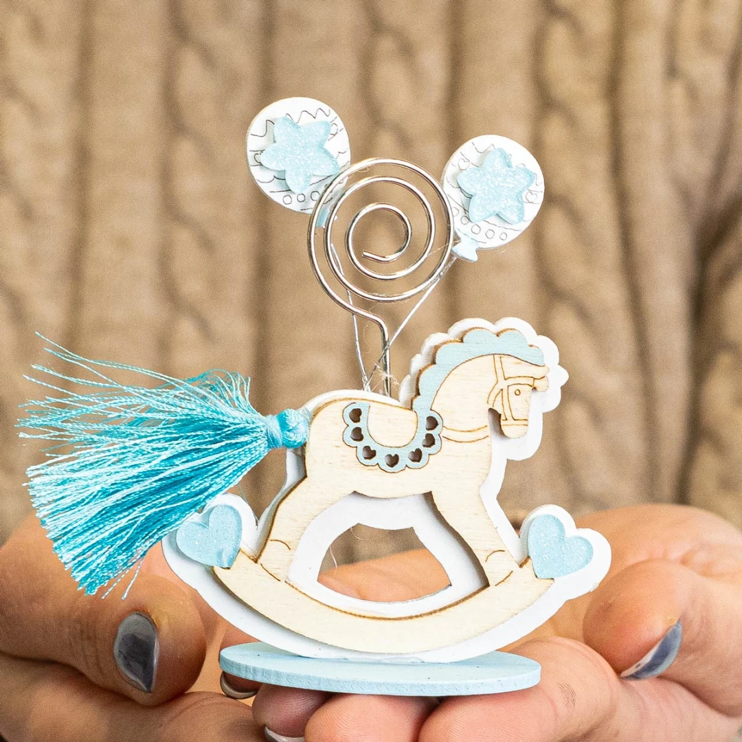 Bomboniere Battesimo e Nascita Bimbo, Linea Cavallino, Clip Segnaposto sulle tonalità del celeste in legno con dettagli glitterati cavallino a dondolo, nappina e palloncini. Prezzo cadauno. Prodotto Artigianale. 7 x 2,5 cm | h 8,5 cm. Cartoncino Omaggio. Arriva assortito in due modelli.