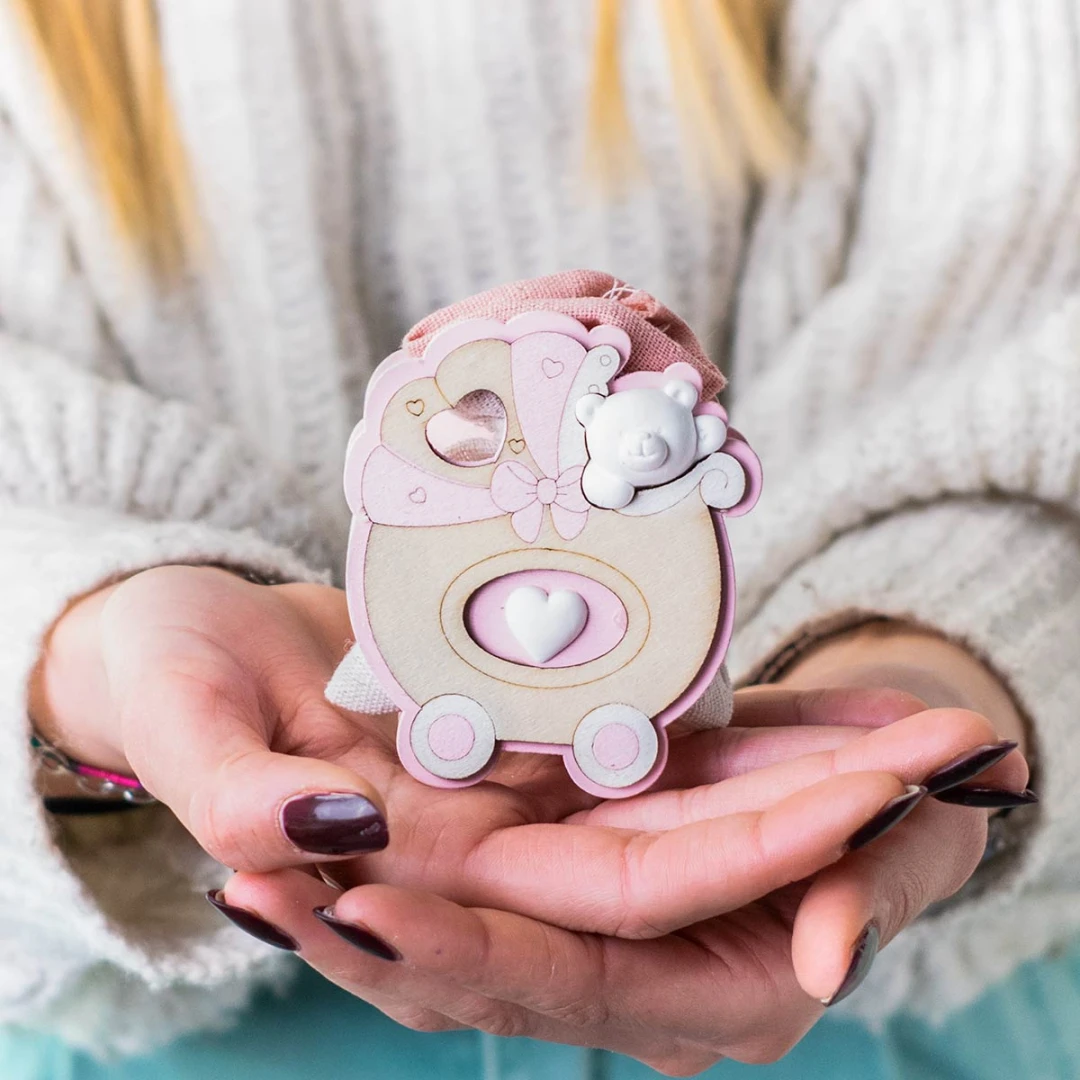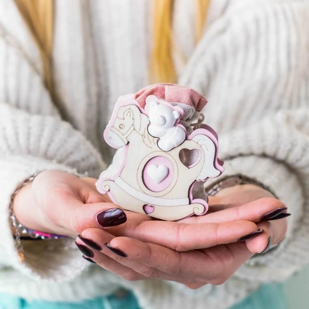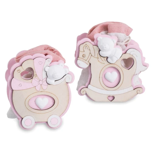 Bomboniera battesimo e nascita per femmina, Scatolina Porta-Sacchetto in legno, con Sacchetto Portaconfetti rosa(con tirante di chiusura) misto in 2 modelli carrozzina e cavallino, misura 7 cm.