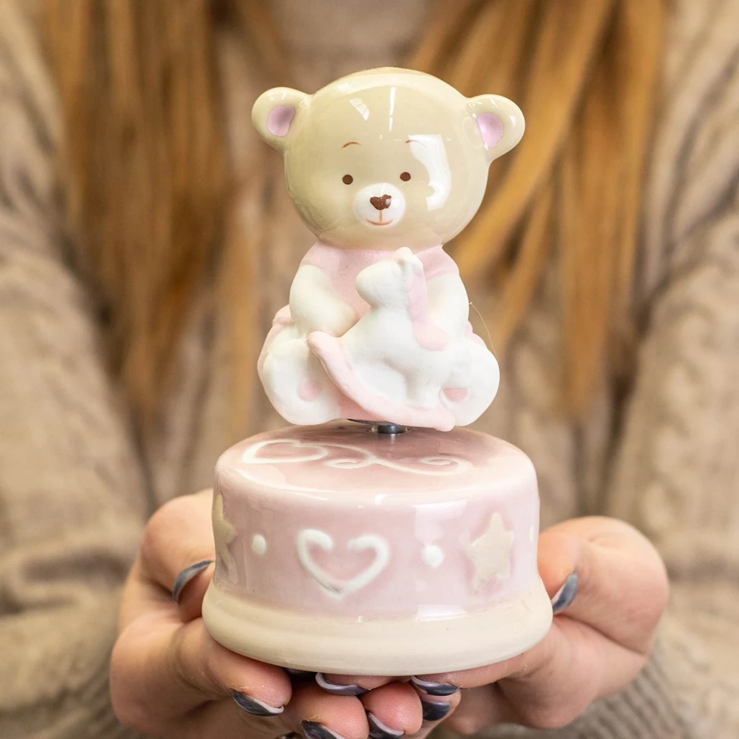 Bellissime Bomboniere Battesimo e Nascita 2026 Linea Bibì Femmina Carillon in porcellana con orsetto rosa decorato. L'orsetto arriva assortito con due oggetti differenti e incluso di scatola. Prezzo cadauno. Prodotto Artigianale. Misura: Ø 8 cm | h 11 cm.