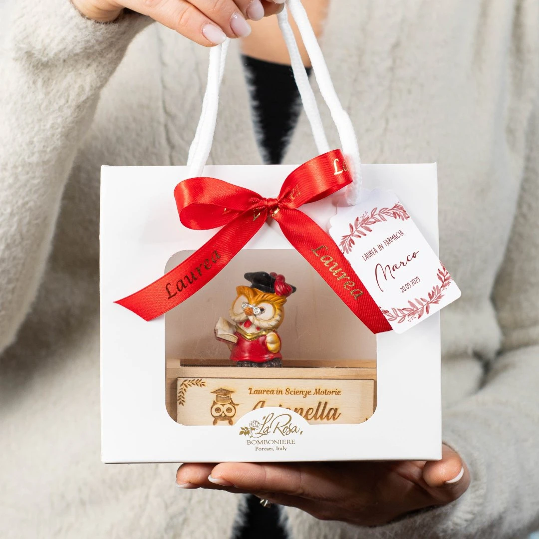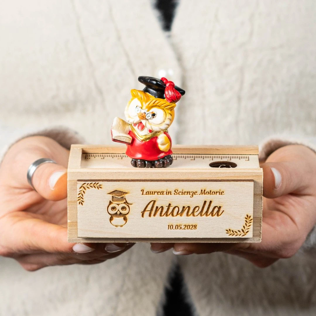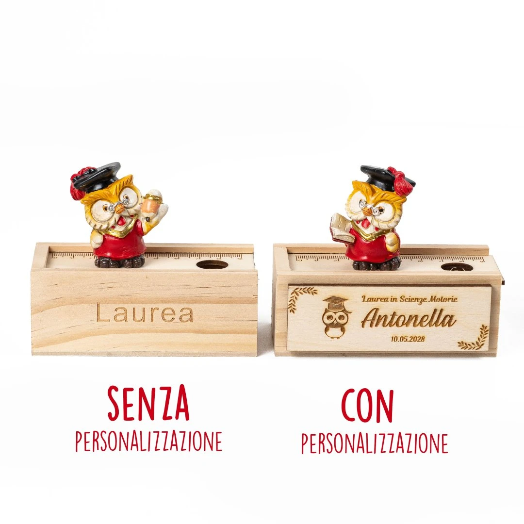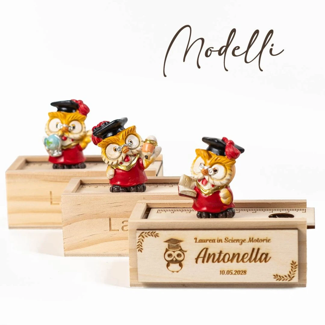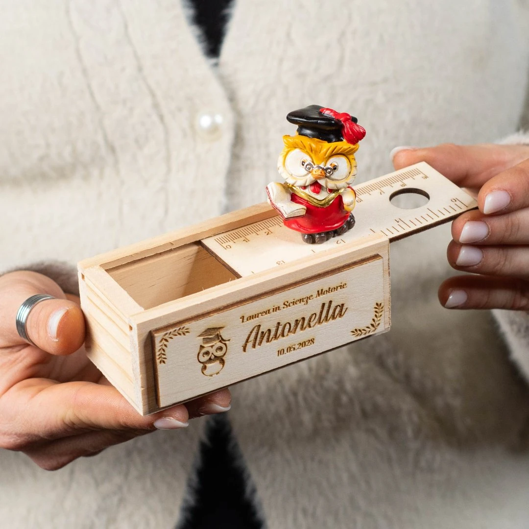 Bomboniere Laurea, Scatolina con righello in legno con gufetto laureato in resina. Sono 3 modelli assortiti, misurano 10,5 x 5cm | h 9 cm (l'altezza si riferisce alla misura della scatola + gufetto). Inoltre, puoi personalizzare la base della scatolina lateralmente con il tuo nome.