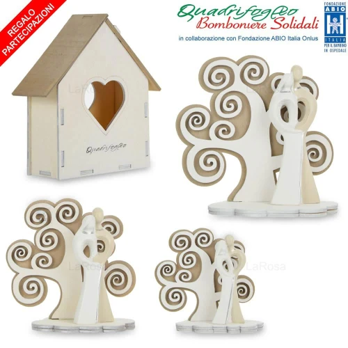 bomboniera matrimonio, linea solidale quadrifoglio CLAIRE, coppia con albero della vita, collezione 2026, idea originale e solidale, parte del ricavato verrà devoluto alla fondazione ABIO (associazione bambini in ospedale), riceverai la bomboniera completa di scatola in legno e certificato di donazione; in piu in regalo le PARTECIPAZIONI complete di stampa per ordini di almeno 40 pezzi.