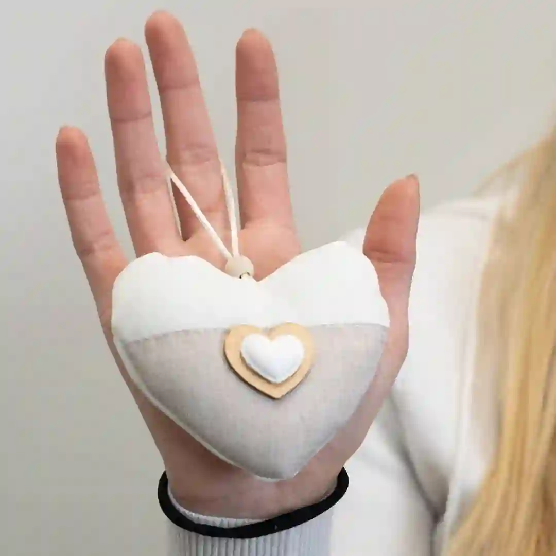 Bomboniere sacchettini portaconfetti Rustici/Eleganti con doppio cuore in legno e gesso bianco. Completo di tirante di chiusura.