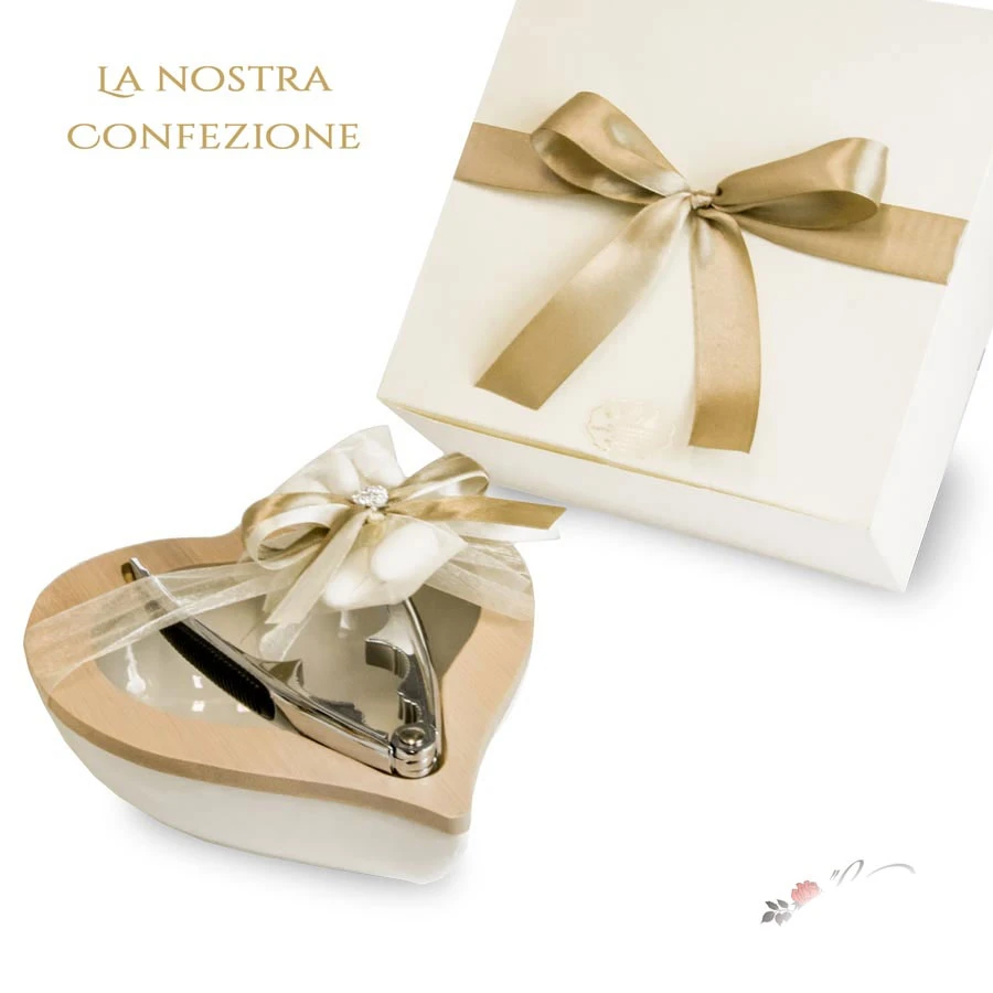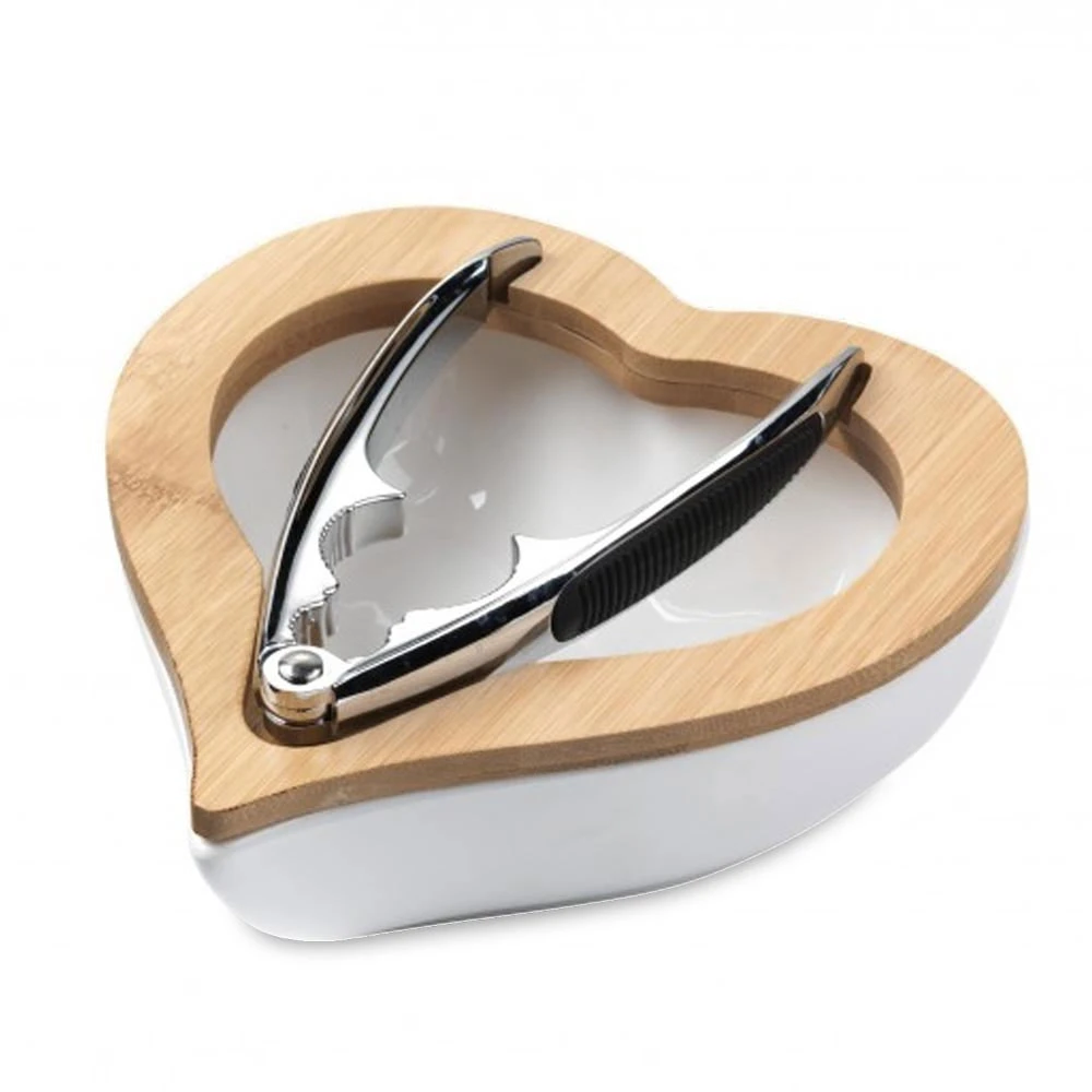 Bomboniere Utili 2026 set Schiaccianoci e Contenitore Cuore in Porcellana bianca e Bamboo, Misura 19x18 cm