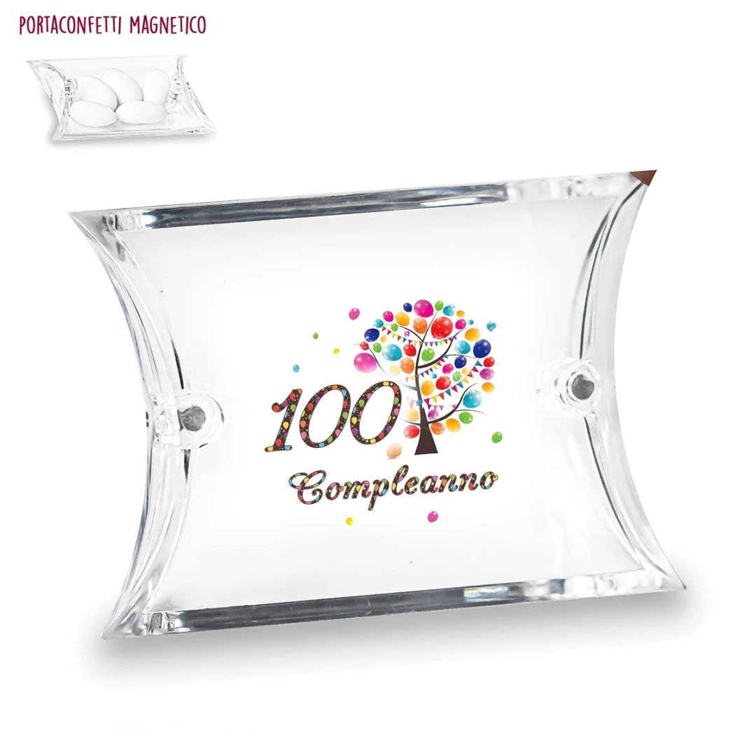 Bomboniere 100° Compleanno Scatolina Portaconfetti magnetica in plexiglass trasparente con stampa numero 100 e albero della vita con palloncini. misura scatolina 9x7x2.5 cm.