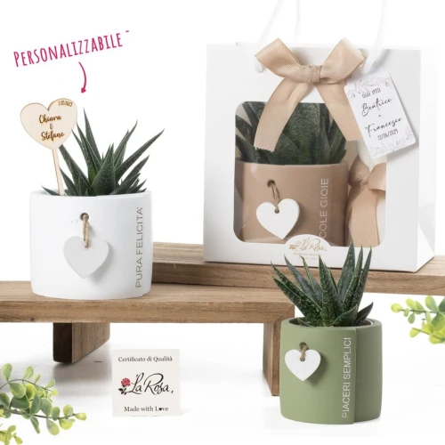 È una bomboniera che piace perché resta: un piccolo angolo verde in casa, ordinato e raffinato, che ogni giorno riporta alla mente la cerimonia. Ideale per chi cerca un “grazie” moderno, facile da abbinare a qualsiasi ambiente e soprattutto impossibile da dimenticare in un cassetto. Disponibili 2 modelli (arrivano assortite nei 3 colori mostrati con scritte assortite: Beige, verde e bianco). Prodotto Artigianale. Prezzo cadauno.