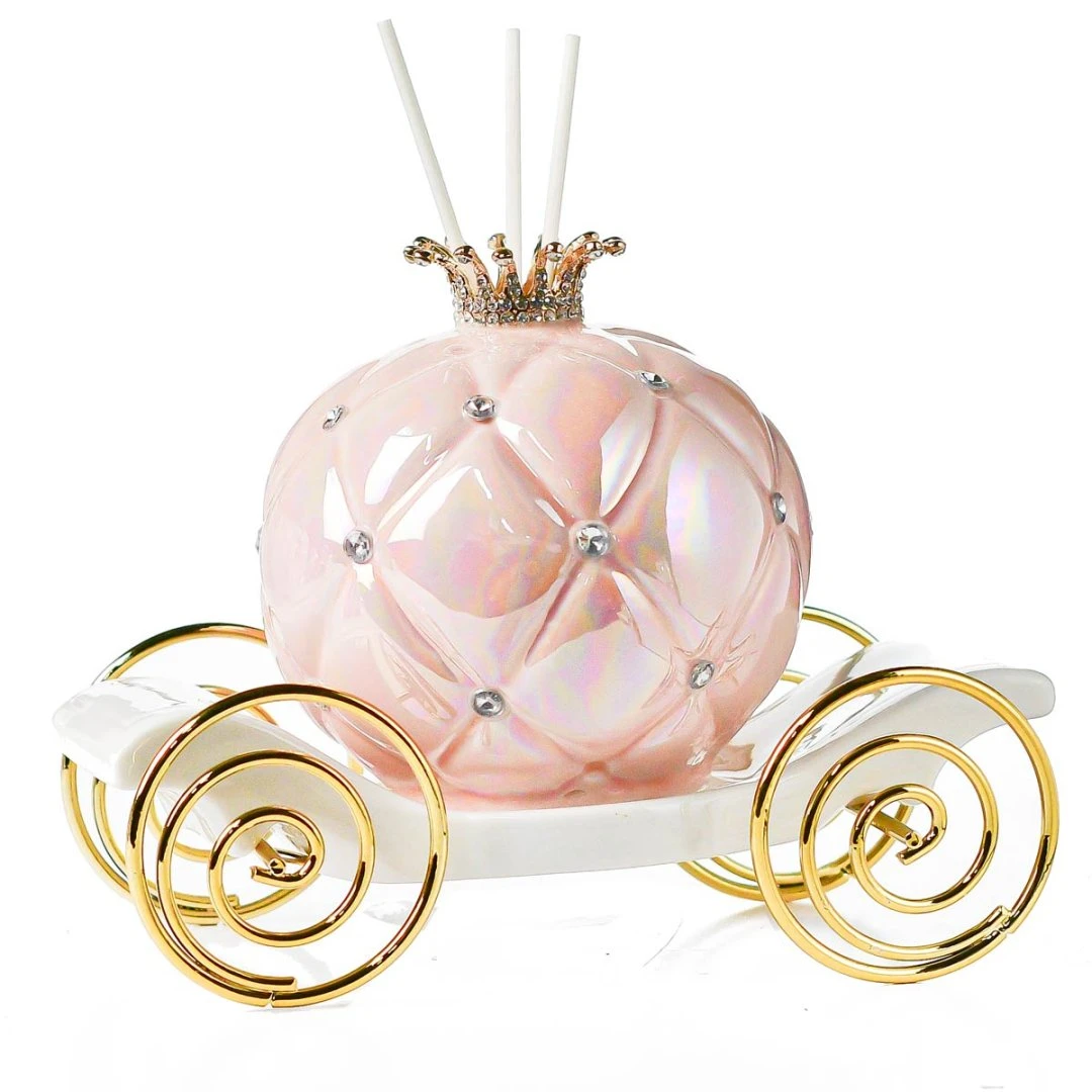 Bomboniere Profumatore Carrozze in ceramica Rosa perlata con corona dorata e strass, puoi scegliere tra misura Standard e Grande, entrambe complete di bellissima scatola rigida con interno in raso, bacchette e profumo.
