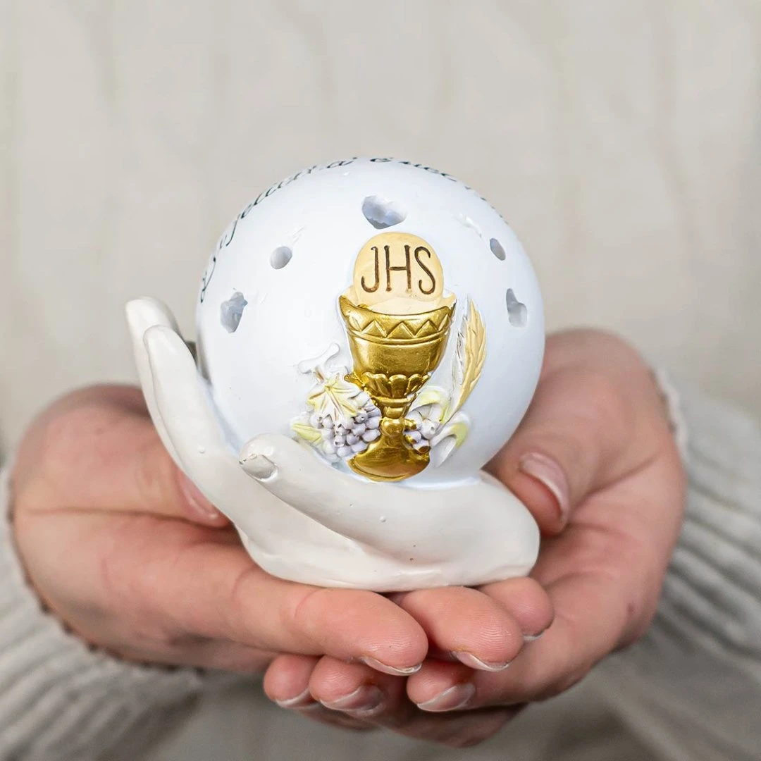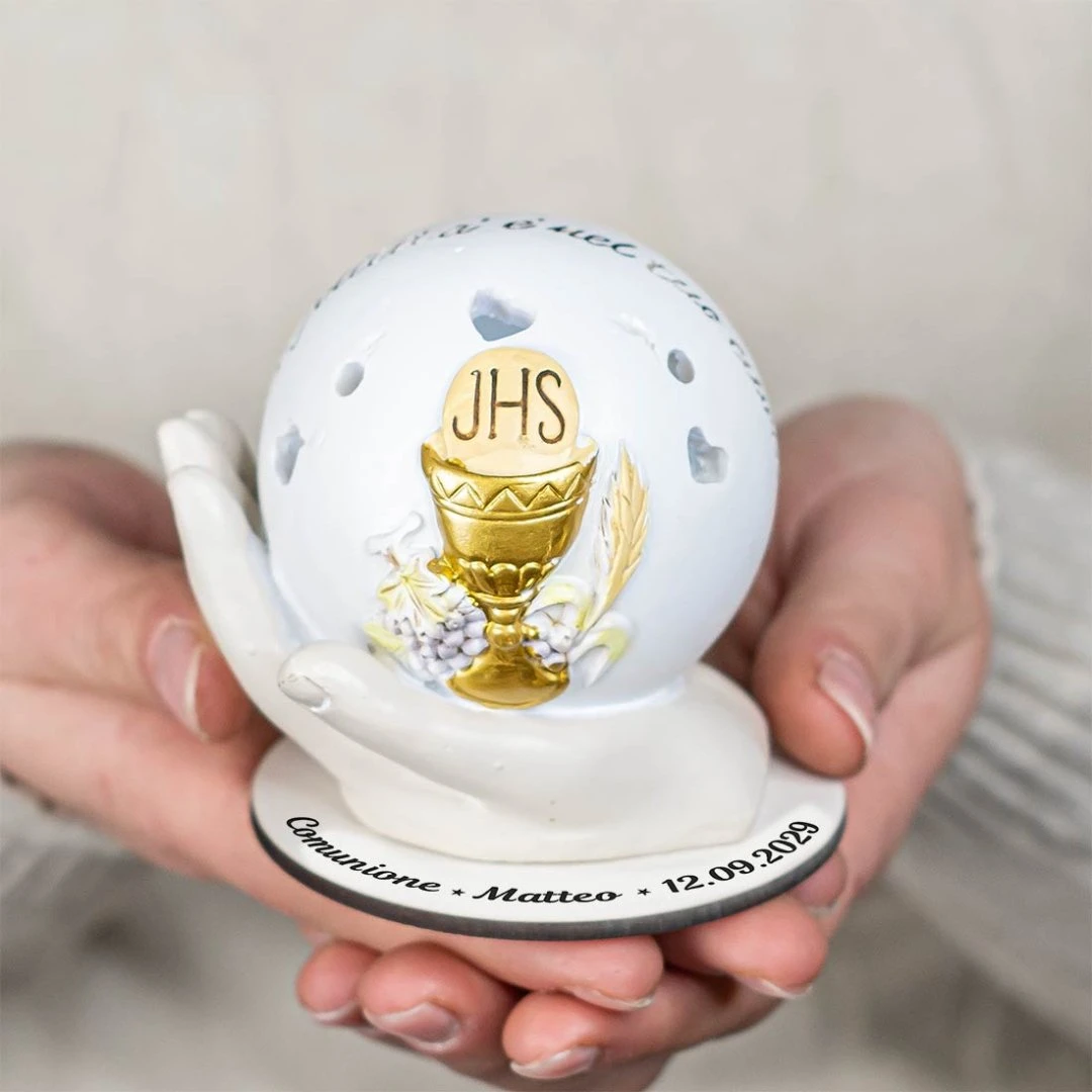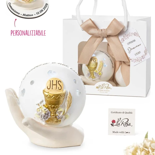 La Collezione RAGGIO Comunione è pensata per lasciare un ricordo che resta acceso nel tempo: una sfera decorata con icona appoggiata su una mano, realizzata in resina e illuminata da luce LED delicata. Un’idea bomboniera adatta a Comunione occasioni speciali, perché unisce significato e atmosfera in un oggetto da tenere in casa. Misura: 5,5 x 7 cm | h 7 cm. Prodotto Artigianale. Prezzo cadauno.