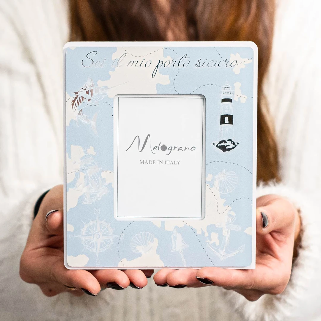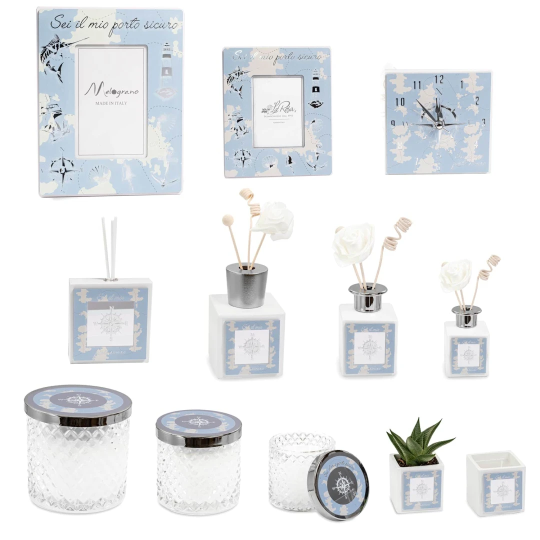 Bomboniere 2026, Linea Mare con dettagli argentati, Portafoto, Profumatori, Candele, Vasi ed Orologio con Bussola e simboli mare con frase "Sei il mio porto sicuro" materiale resina e plexiglass a specchio, articoli di ottima qualità, dal vivo rendono molto di più, disponibili in diversi modelli. completi di scatola e certificato di qualità (per profumatori anche bacchette e profumo).