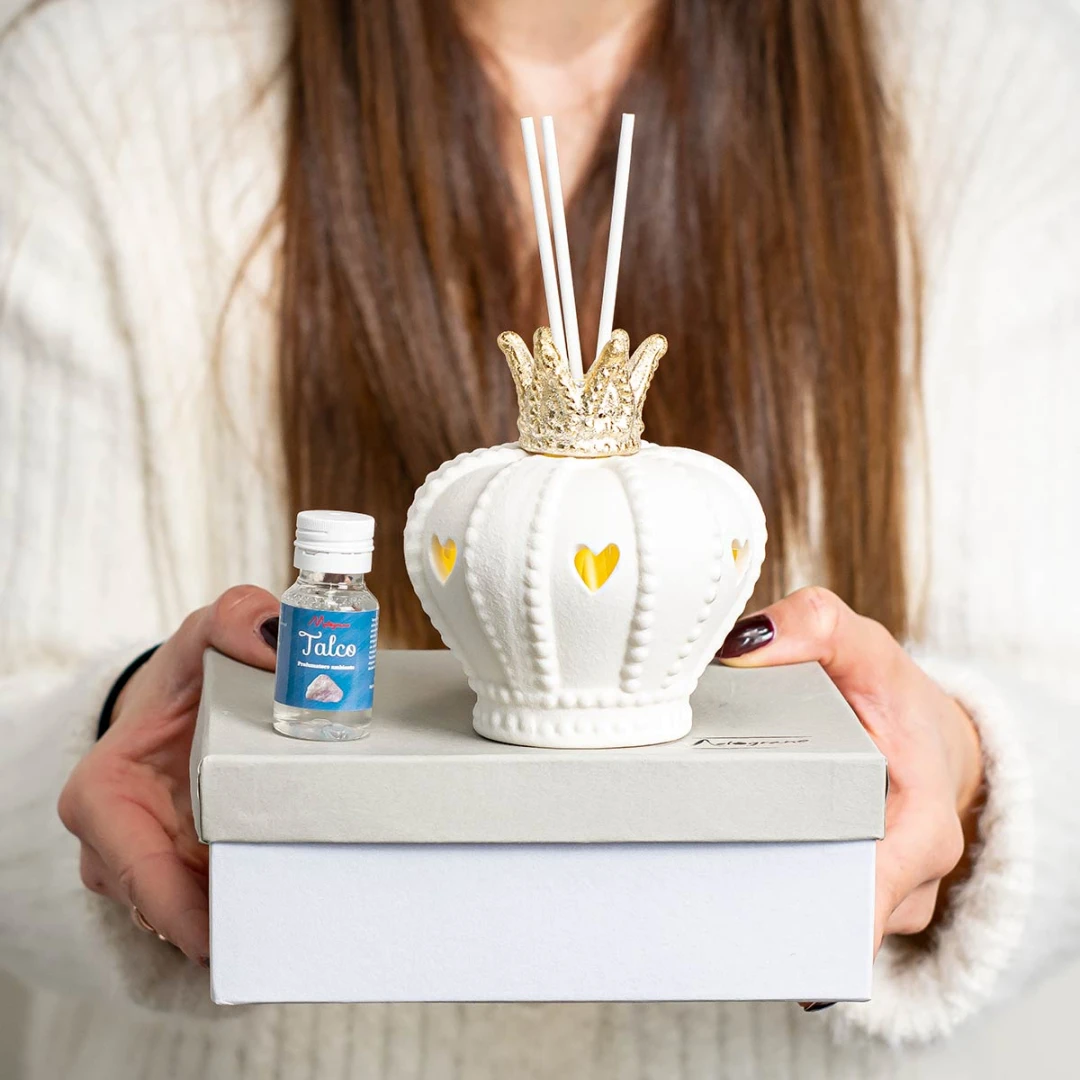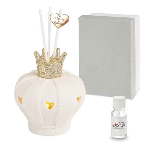 Bellissime Bomboniere 2026 ideali per Comunione Femmina, Nozze oro o Matrimonio, Profumatore Corona in ceramica con cuori a LED. Bacchette e profumo inclusi. Prezzo cadauno. Prodotto Artigianale. Misura: 9 x 9 x 10 cm. Inoltre, è possibile personalizzarle con un cuore in plexiglass inciso con i propri nomi.