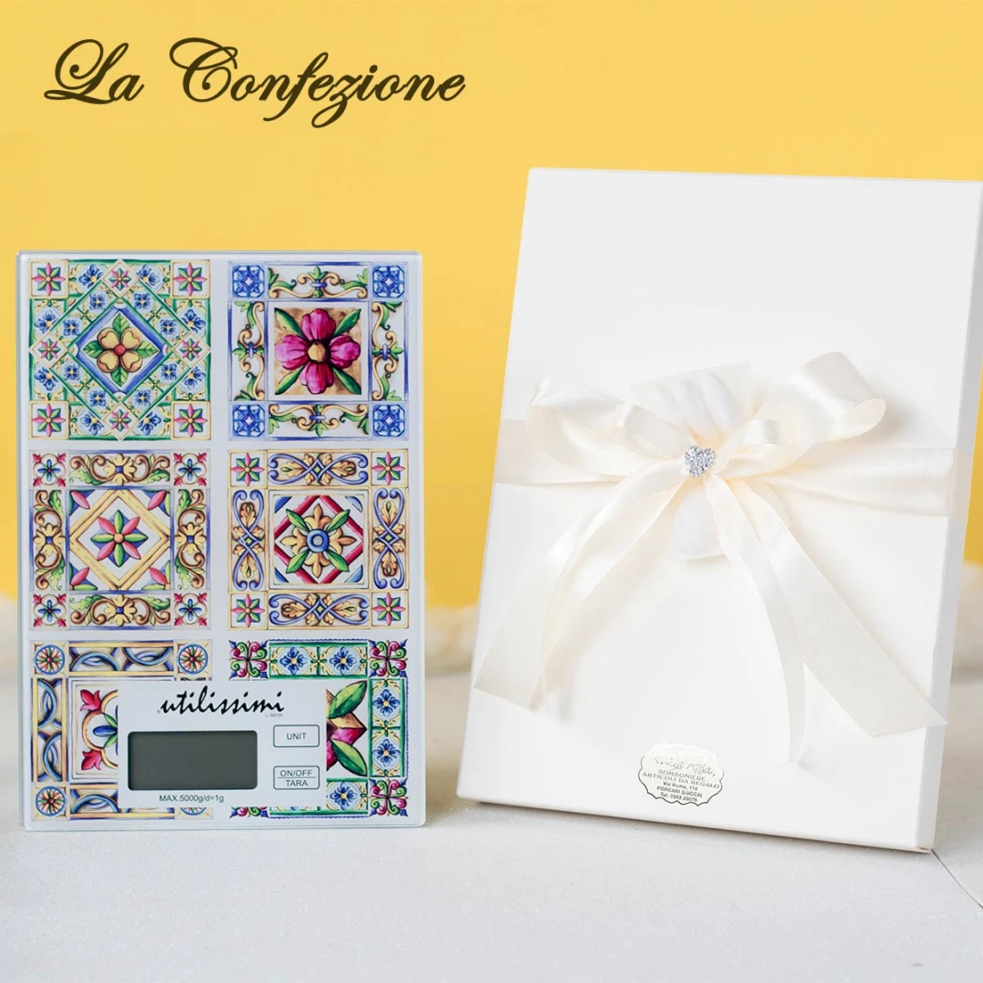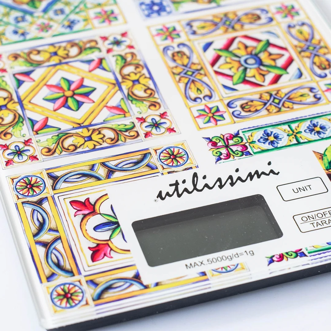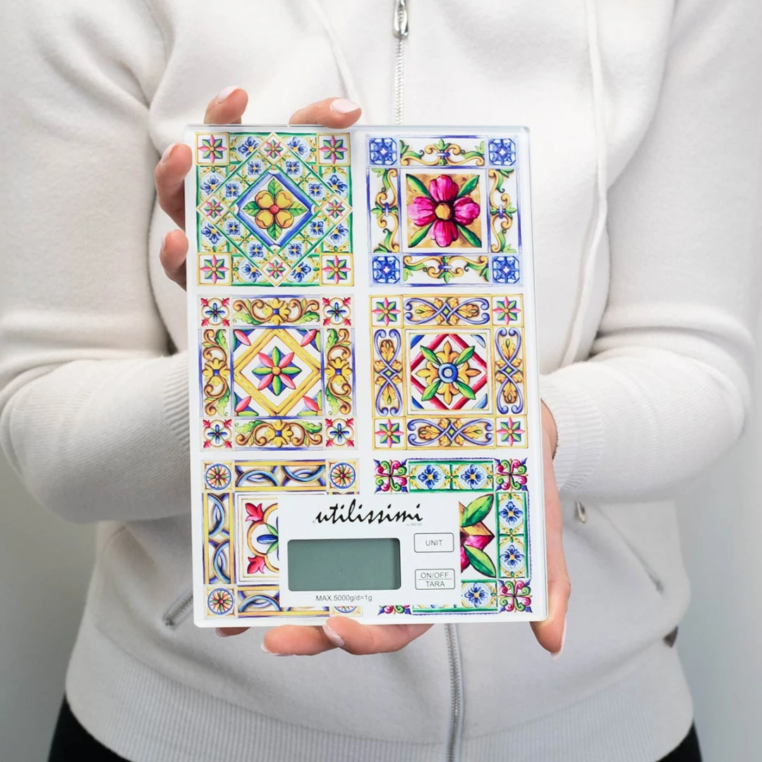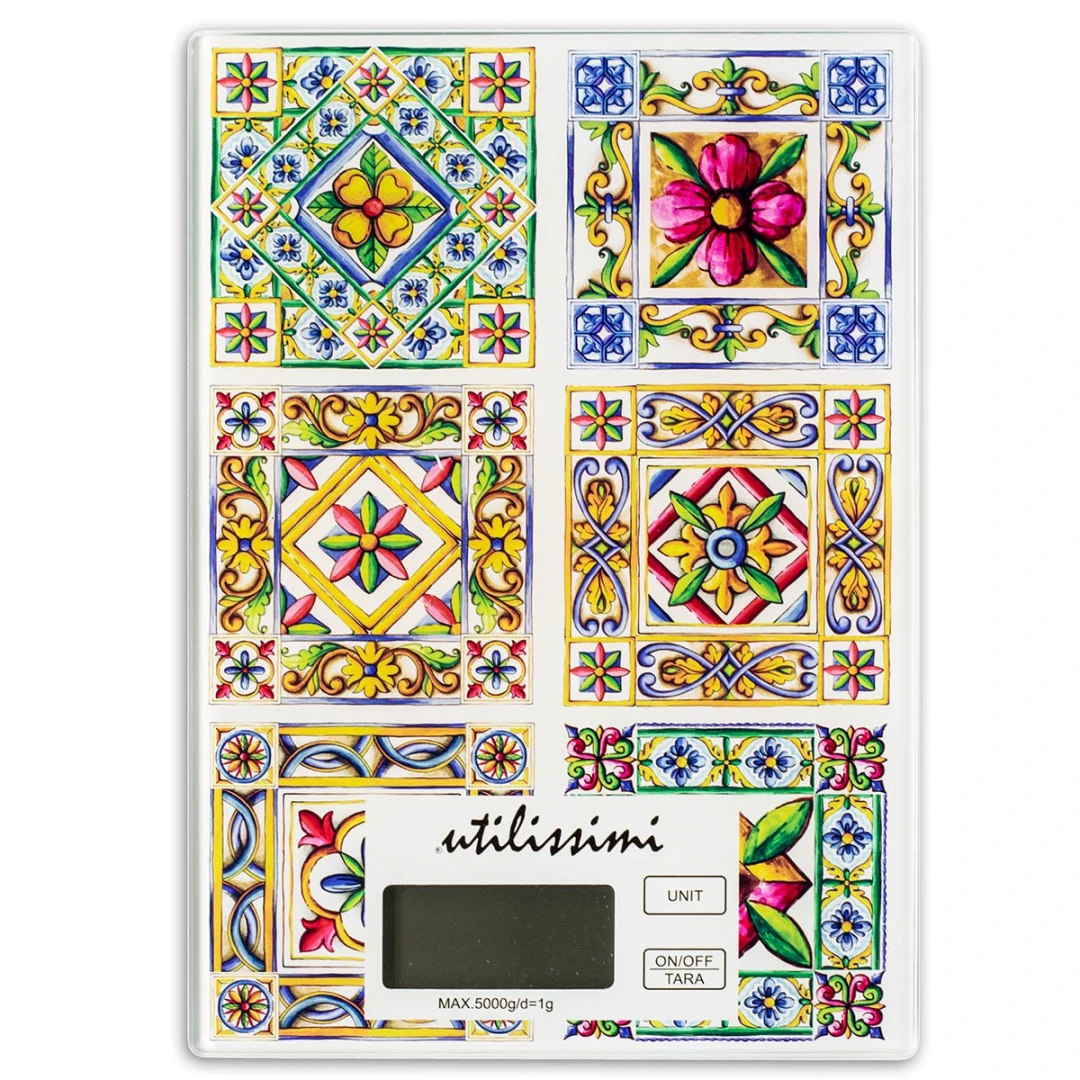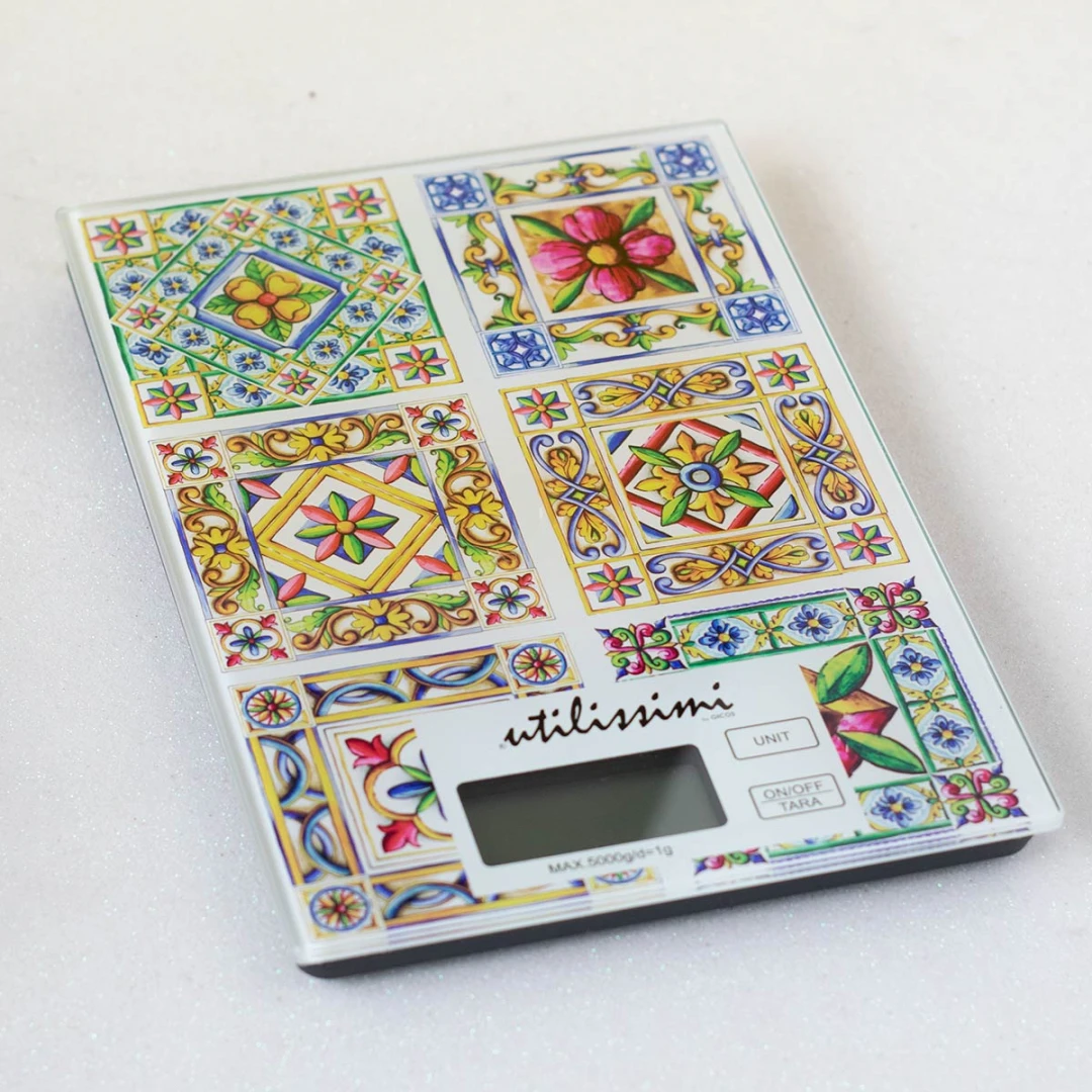 Bomboniere Maioliche bilancia da cucina in vetro con decori maioliche colorate, articolo di tendenza 2026, misura 15x22x1.5 cm.