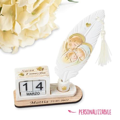 Bellissime Bomboniere 2026 Linea PLUME Icona in resina Piuma con Sacra famiglia, nappina e calendario. Prezzo cadauno. Prodotto Artigianale. Misura: h 12 cm.