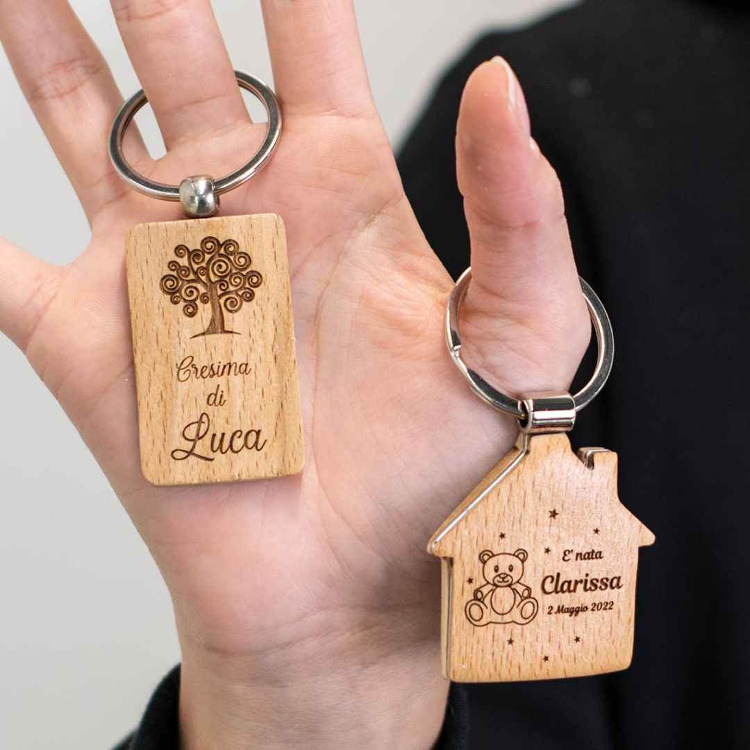 Bomboniere per ogni cerimonia, portachiavi in metallo e bamboo di varie forme tra tonda, rettangolare, bimbo, bimba, casa ecc puoi personalizzarlo con incisione del nome e data, scegli tra le grafiche proposte oppuere richiedi una grafica su misura!