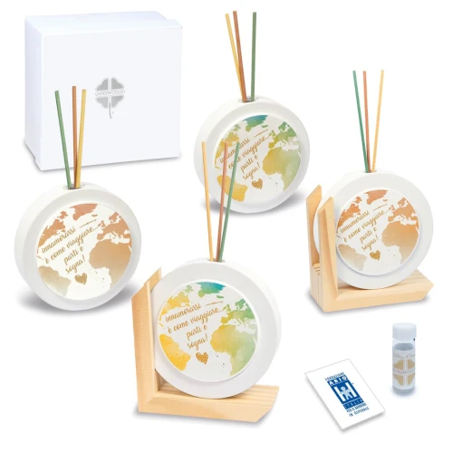 Bomboniere Solidali Quadrifoglio 2026 Linea Soffio, composta da Profumatori tema viaggio con grafica coordinata, ottimo compromesso tra bomboniera e beneficienza, parte del ricavato sarà devoluto alla fondazione ABIO (ass.italiana per il bambino in ospedale), complete di certificato di donazione e scatola. Sono disponibili due modelli ed arrivano in due colorazioni assortite e completi di bacchette e profumo. Prezzo cadauno. Prodotto Artigianale.