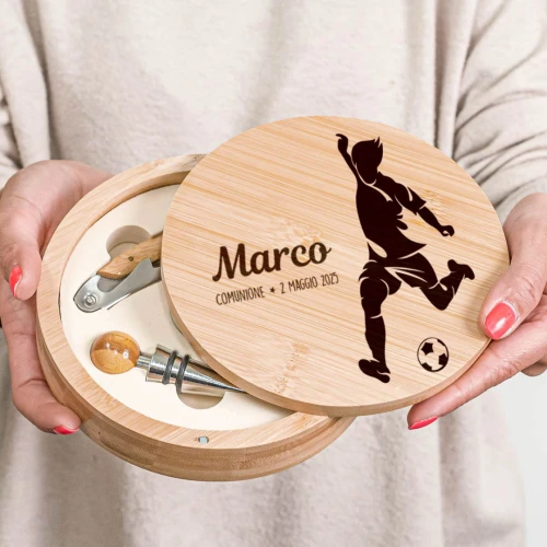 Bomboniere matrimonio cofanetto con accessori vino inciso in bamboo, bellissima idea come bomboniera originale ed utile. Prodotto di altissima qualità.