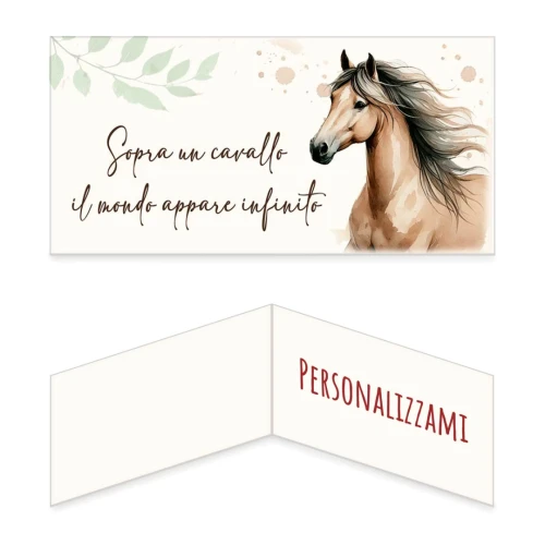Bigliettini Bomboniere adatti per tutte le cerimonie, con cavallo circondato da foglioline e frase, stampa interna inclusa se selezionata nelle opzioni.