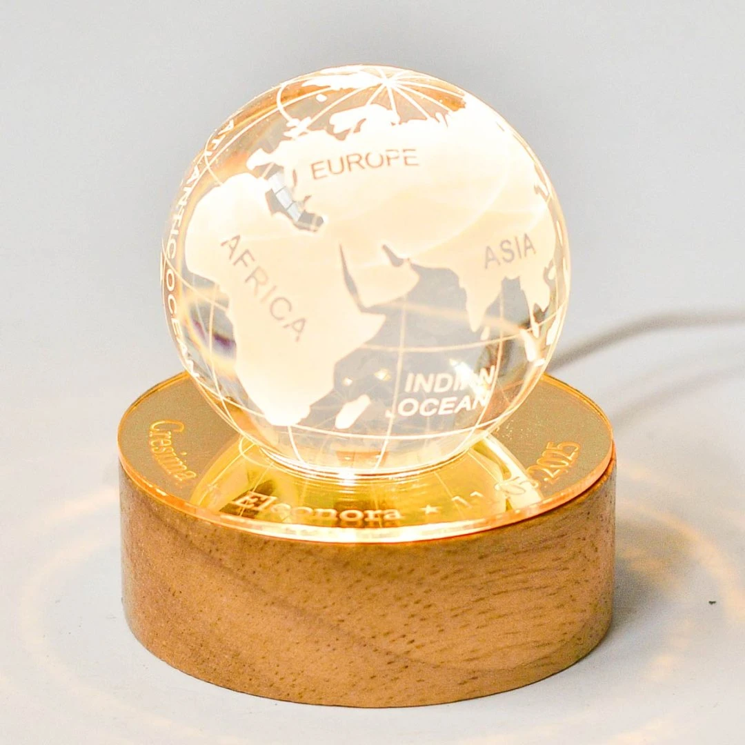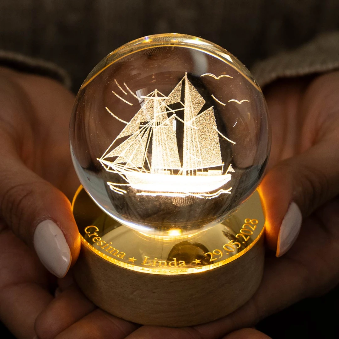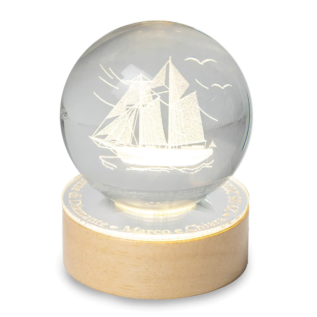 Bellissime Bomboniere Cresima 2026, Sfera in vetro con grafica in 3D, (si vede da tutti i lati) su base in legno a LED e con possibilità di personalizzarla su base in plexiglass a specchio. Prodotto Artigianale. Misura: Ø 6 cm | h 9 cm.