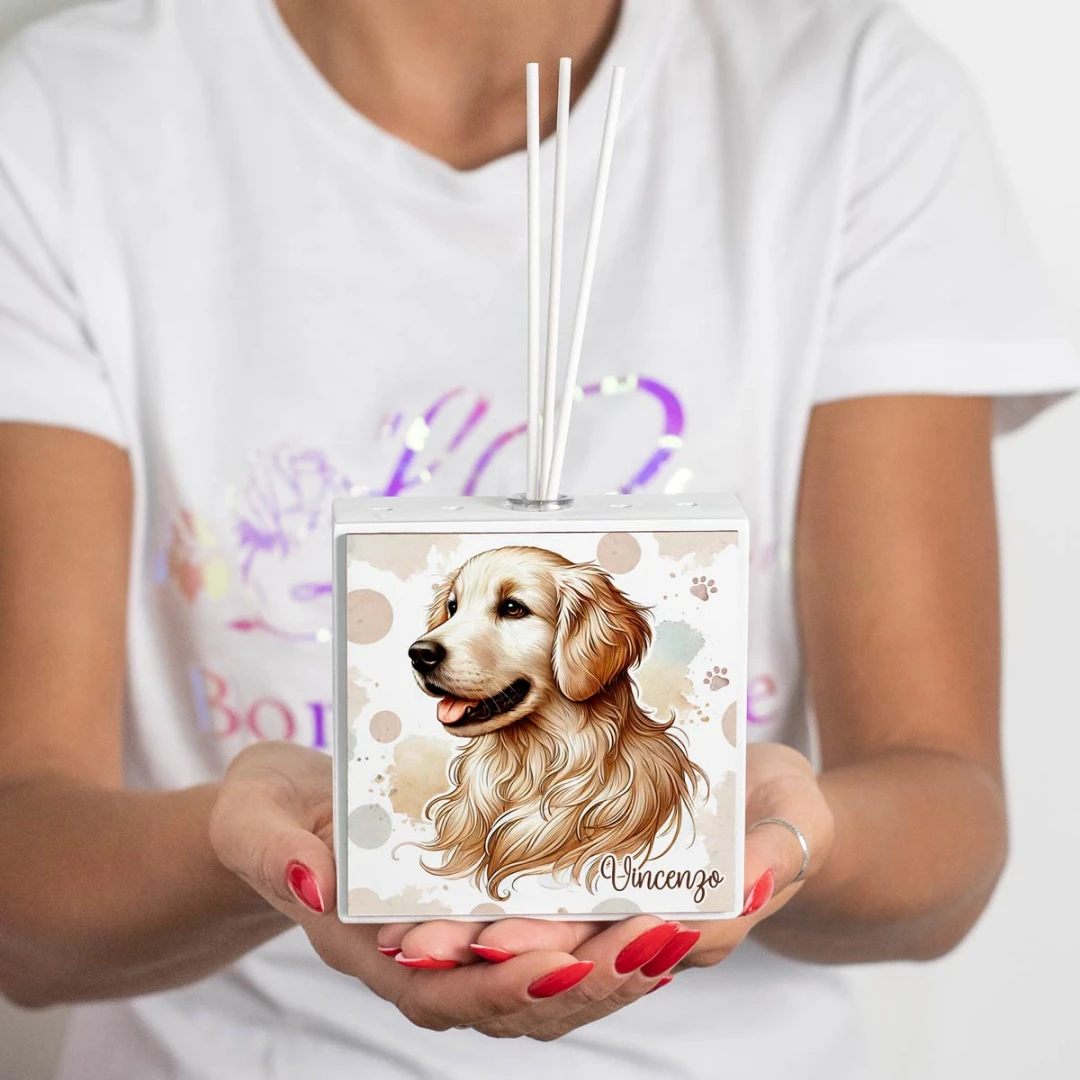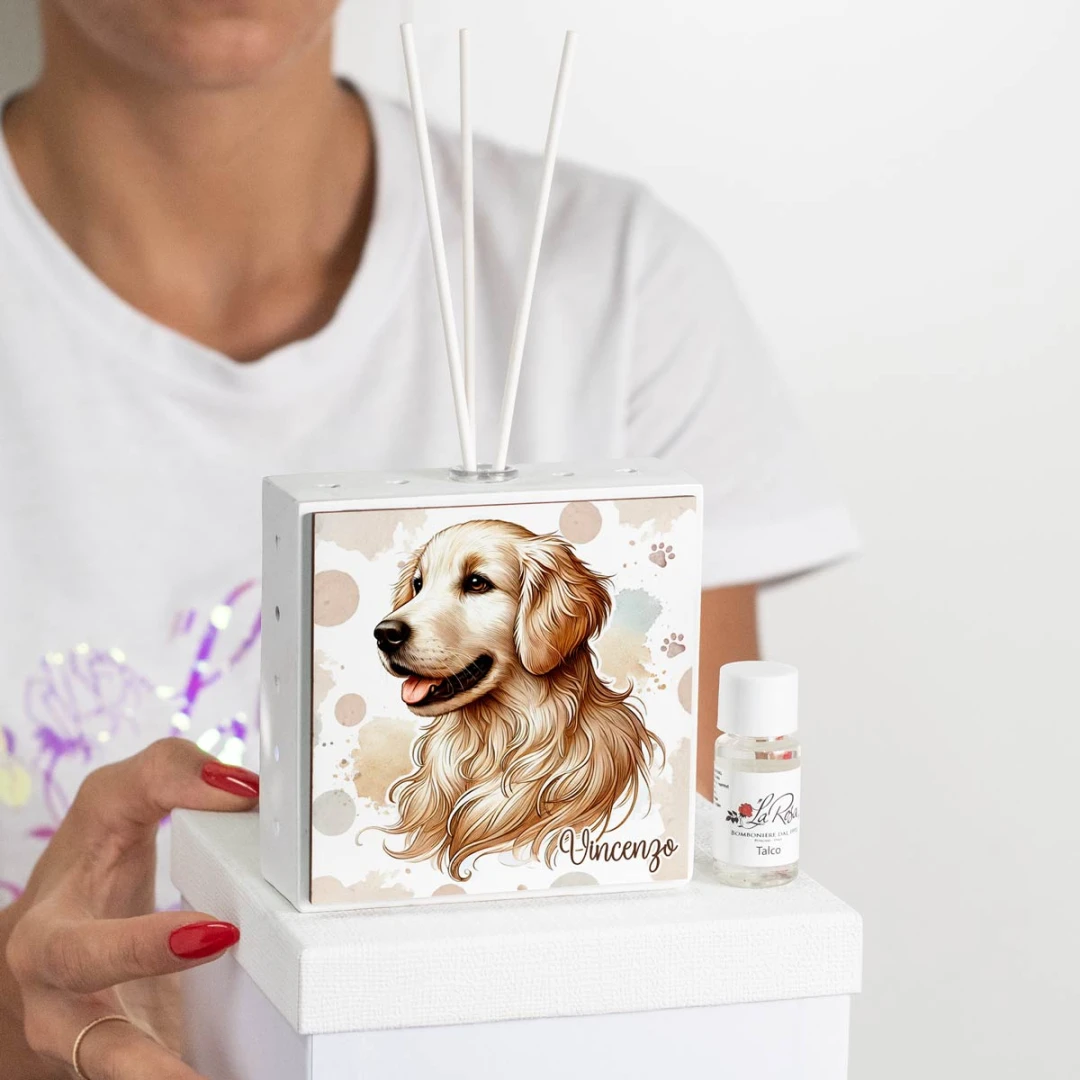 Bomboniere Profumatore a LED personalizzabile con grafica cagnolino con impronte, arriva completo di batterie, bacchette, profumo e scatola. misura: 10,5 x 4 cm | altezza: 10,5 cm | altezza con bacchette: 20 cm.