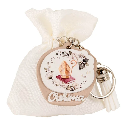 Bomboniere Santa Cresima, Linea Santus, Portachiavi in legno con cappello e bastone impreziosito da scritta glitterata con nappina bianca e sacchettino portaconfetti avorio. Il prezzo si riferisce ad 1 sacchetto. Prodotto Artigianale. Misura sacchettino: 9 x 8 cm | Misura portachiavi: 10 x 5 cm.