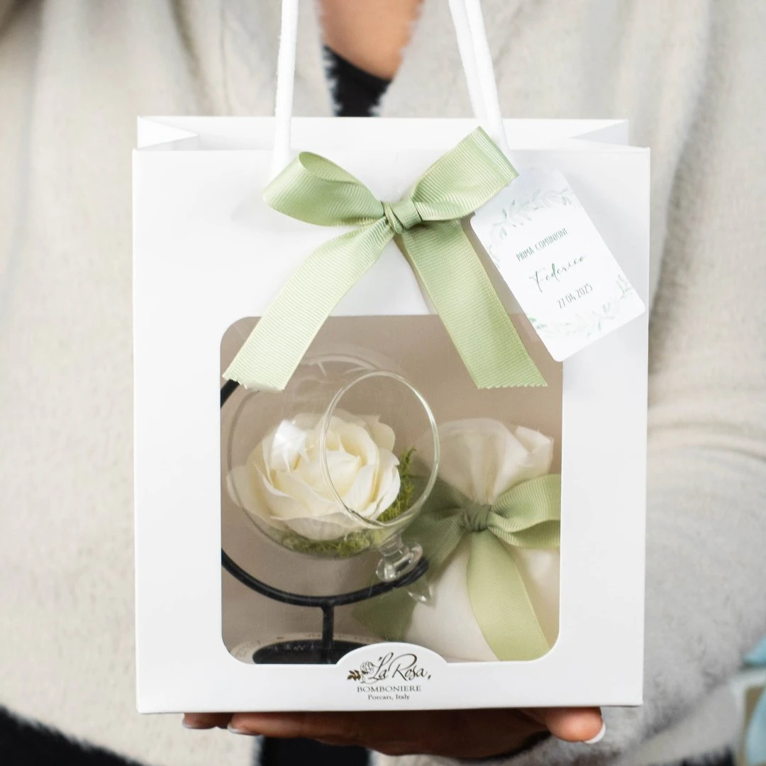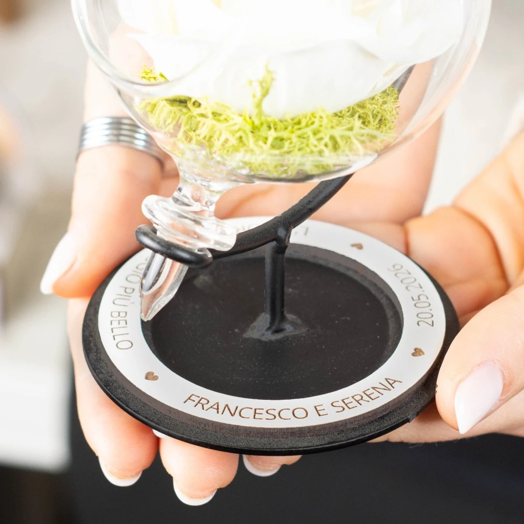 La base in metallo è personalizzabile con incisione di nomi, date o frasi speciali. All’interno è incluso il profumo e la rosa decorativa su letto di muschio.