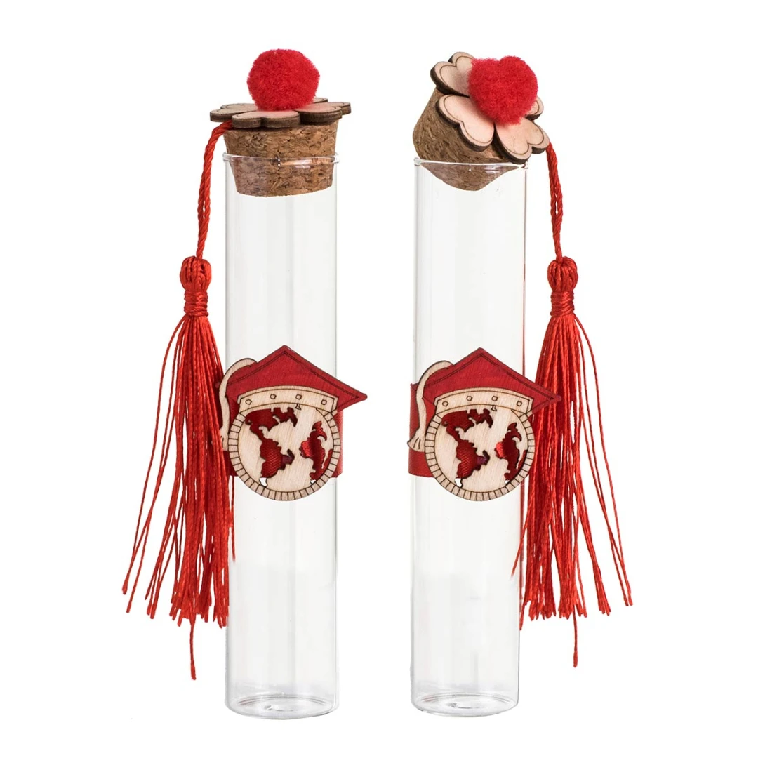Bomboniere Laurea originali, Provetta in Vetro Portaconfetti con tappo di sughero e quadrifoglio in legno e nappina rossa, decoro al centro con mondo laureato. misura 14 cm.