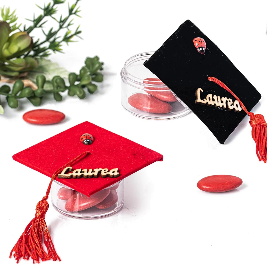 Scatolina Tocco Laurea Portaconfetti in velluto rosso o nero con coccinella rossa e scritta laurea in legno, la base portaconfetti è in plexiglass con chiusura a vite, può contenere 5 confetti e il bigliettino. misura 7x7x3,5 cm