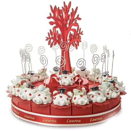Torta Bomboniere Laurea 20 fette portaconfetti con coccinelle clip e albero della vita rosso centrale, la torta arriva già montata come da foto con nastri, struttura, fette,coccinelle e albero centrale.