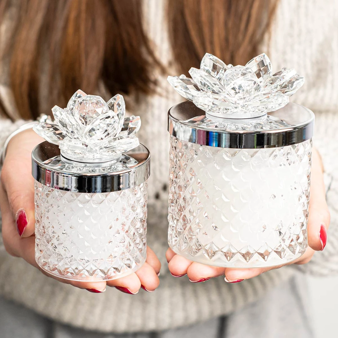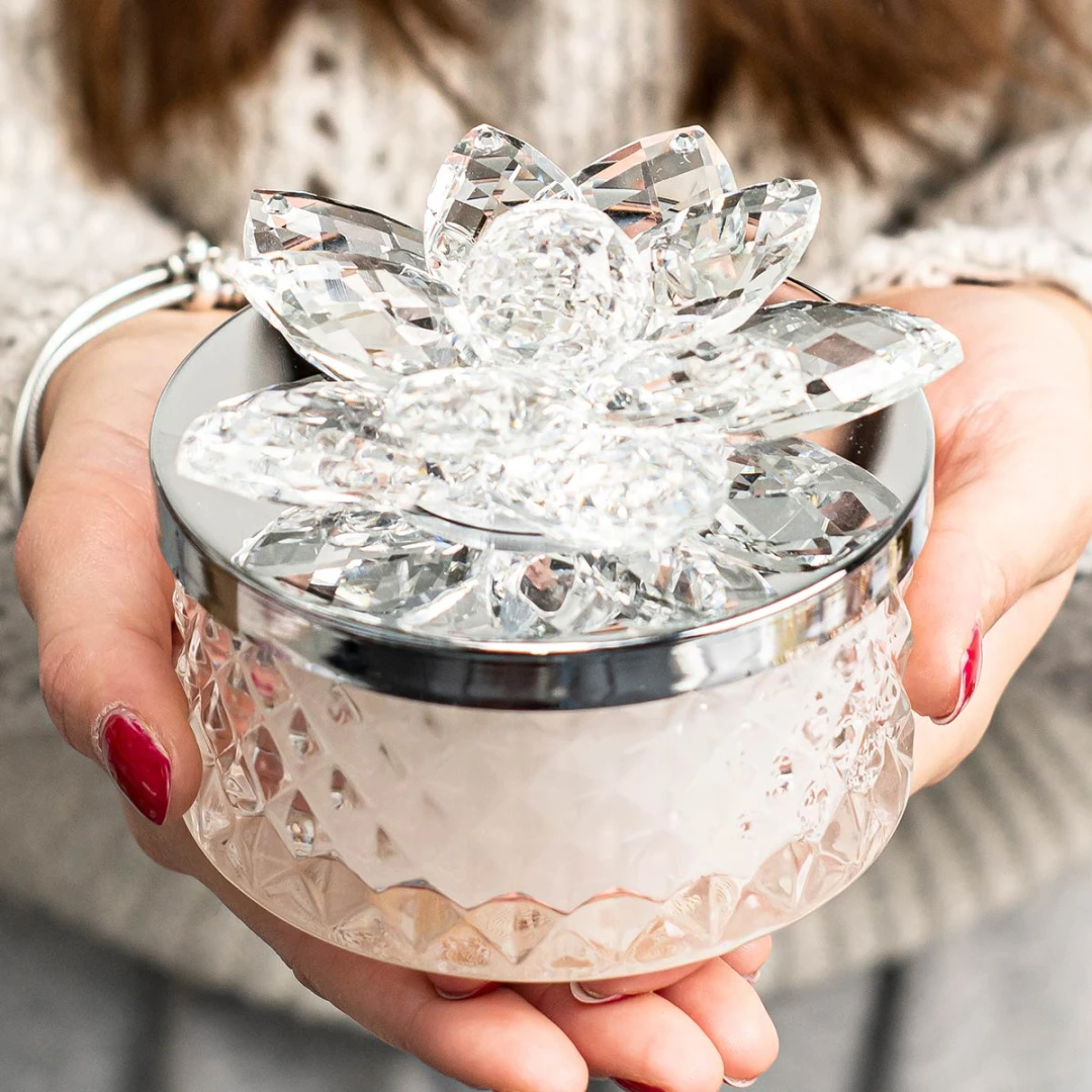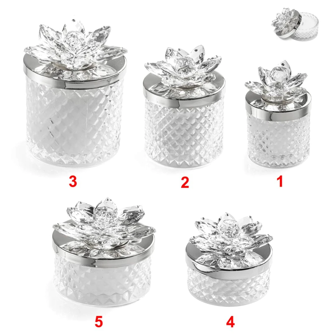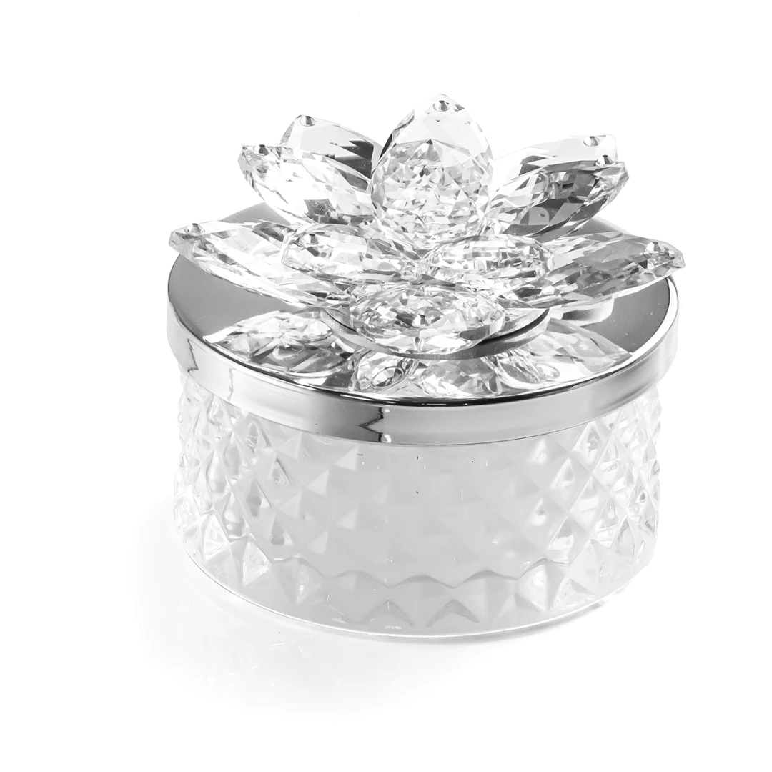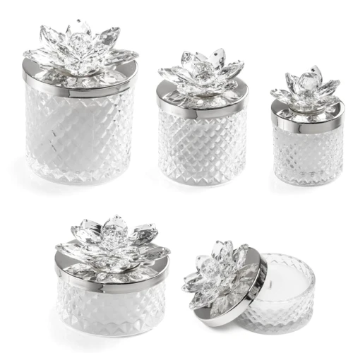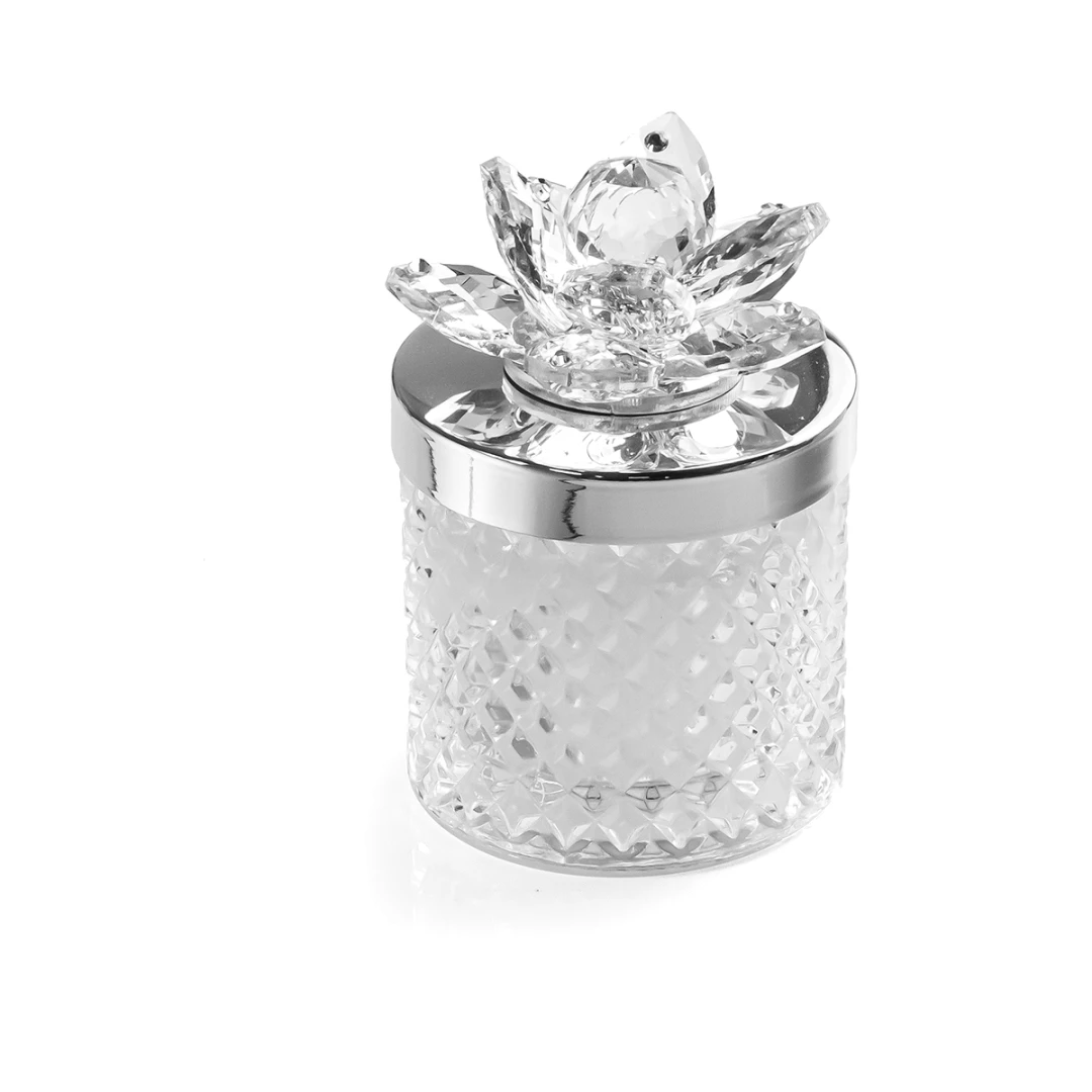 Bomboniere 2026, Candela Diamond Argentata con tappo decorato da fiore in cristallo swarovski e base in vetro, articolo di ottima qualità, dal vivo rende molto di più, disponibile in diversi modelli. completa di scatola e certificato di qualità.