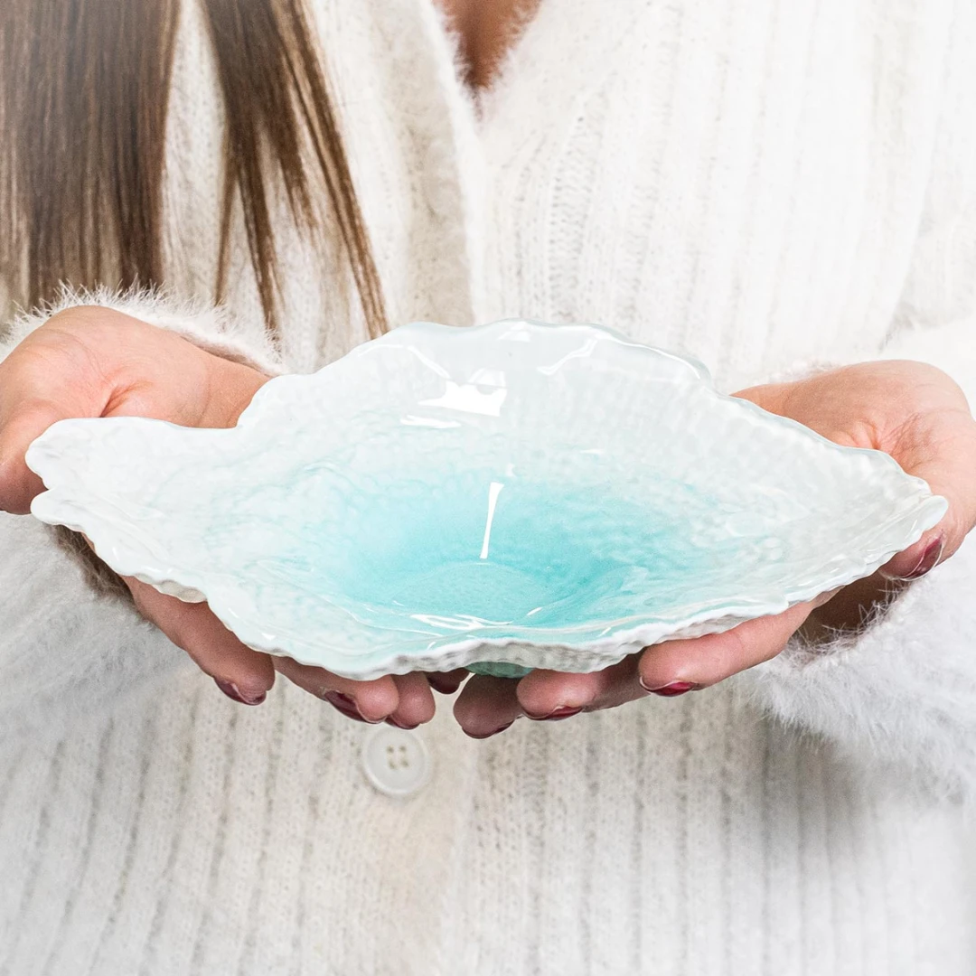 Bomboniere collezione 2026, ciotola utilizzabile come svuotatasche o portacandela materiale vetro a forma di ostrica, colore tiffany che sfuma sul bianco, articolo di ottima qualità, dal vivo rende molto di più, misura 19,5x14,5x4 cm, completo di certificato di qualità