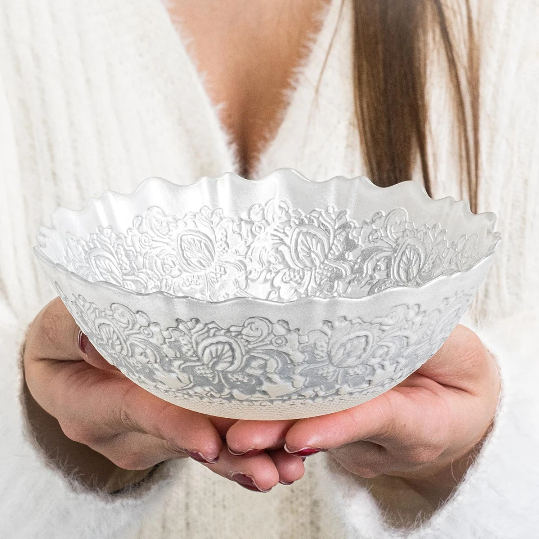 Bomboniere collezione 2026, ciotola utilizzabile come svuotatasche o portacandela materiale vetro con ghirigori floreali, colore bianco metallizzato, articolo di ottima qualità, dal vivo rende molto di più, misura 16x16x5,5 cm, completo di certificato di qualità