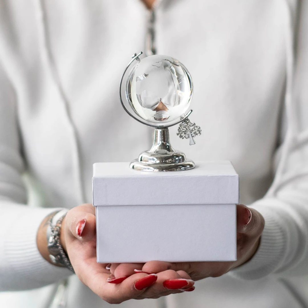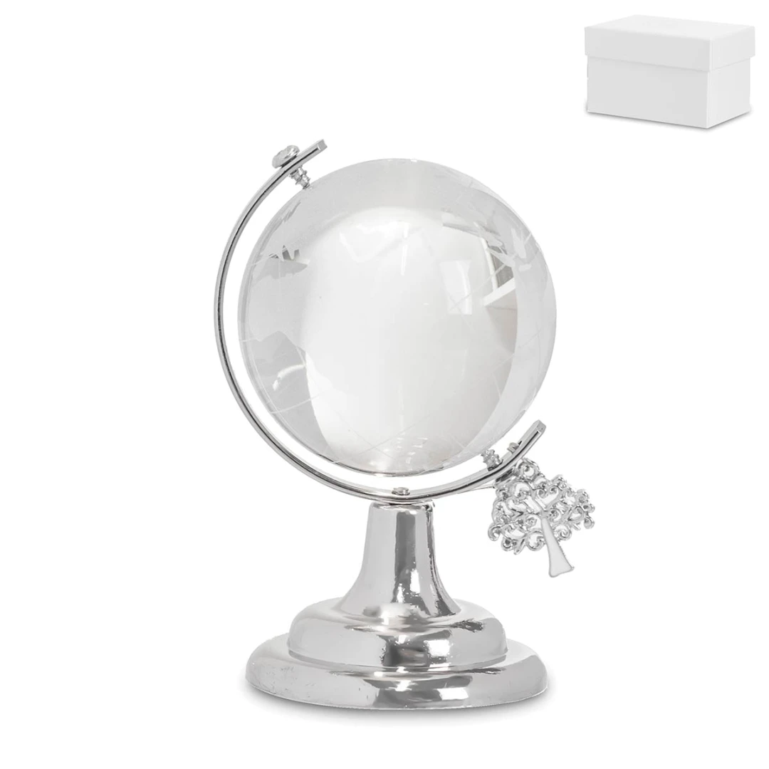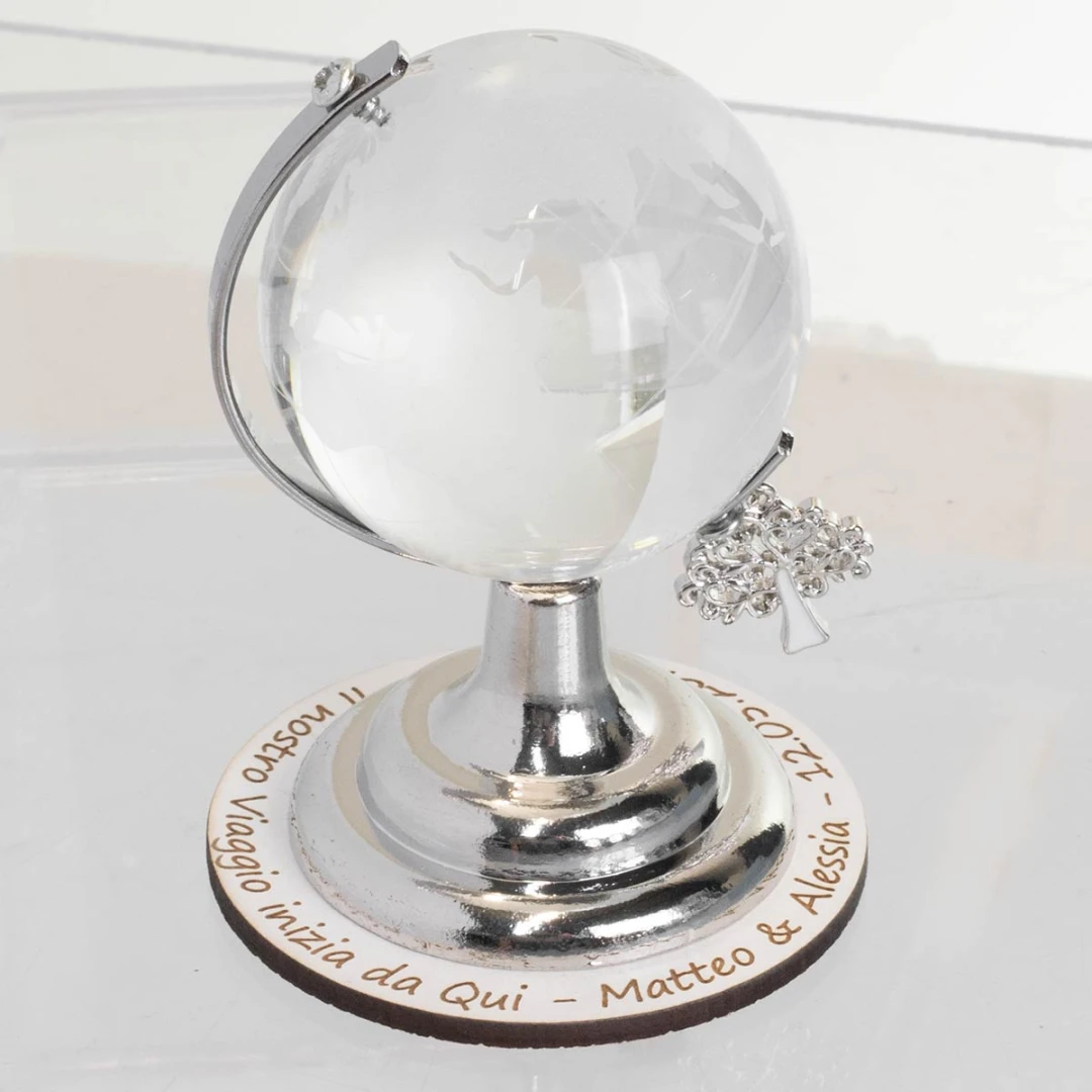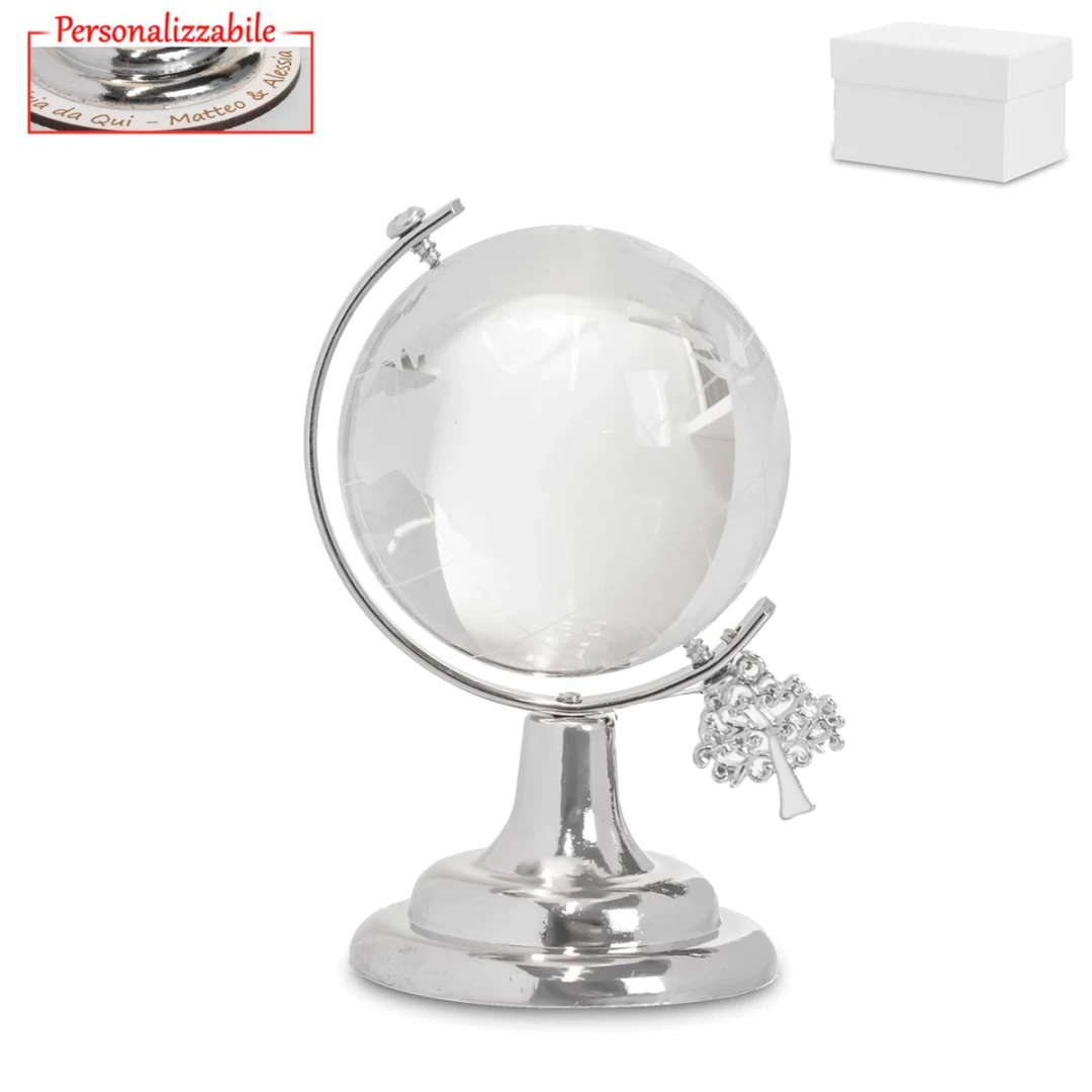 Bomboniere Originali 2026, mappamondo in cristallo e metallo, con ciondolo simbolo albero. puoi rendere unica la tua bomboniera con la base personalizzata con nome, facoltà, data o frase, misura 8 cm, completo di scatola.