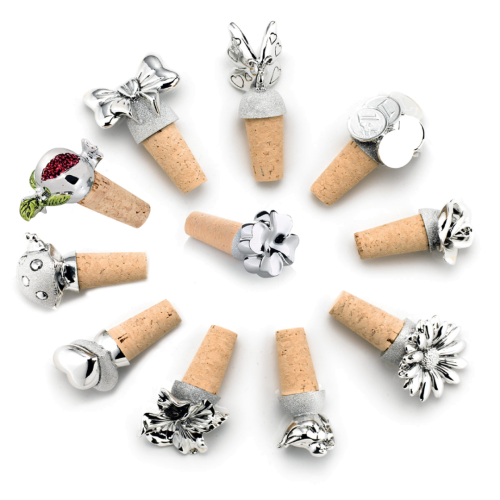 linea Bomboniere utili Tappi di sughero in argento. Scegli il modello tra Cuori, Coccinella, Farfalla, Rosa, Gerbera, Fiocco, Quadrifoglio, Uccellini, Orchidea, Monete e Melograno. adatta ad ogni cerimonia, anche matrimonio a tema vino!