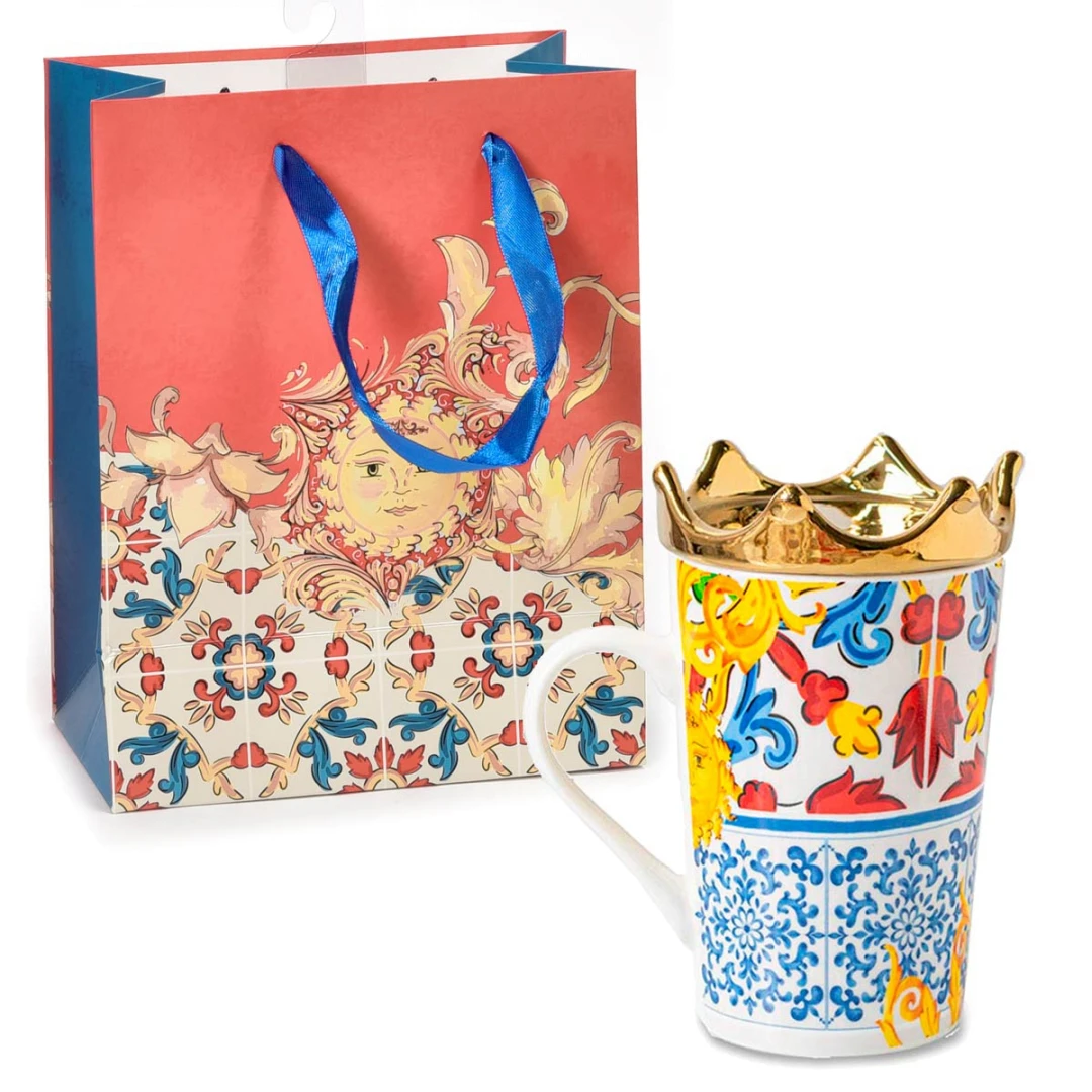Bomboniere Maioliche Tazza Mug in porcellana con decori, misura tazza 12x9x15 cm, capienza 400ml, completa di shopper 10x18 h 23 cm