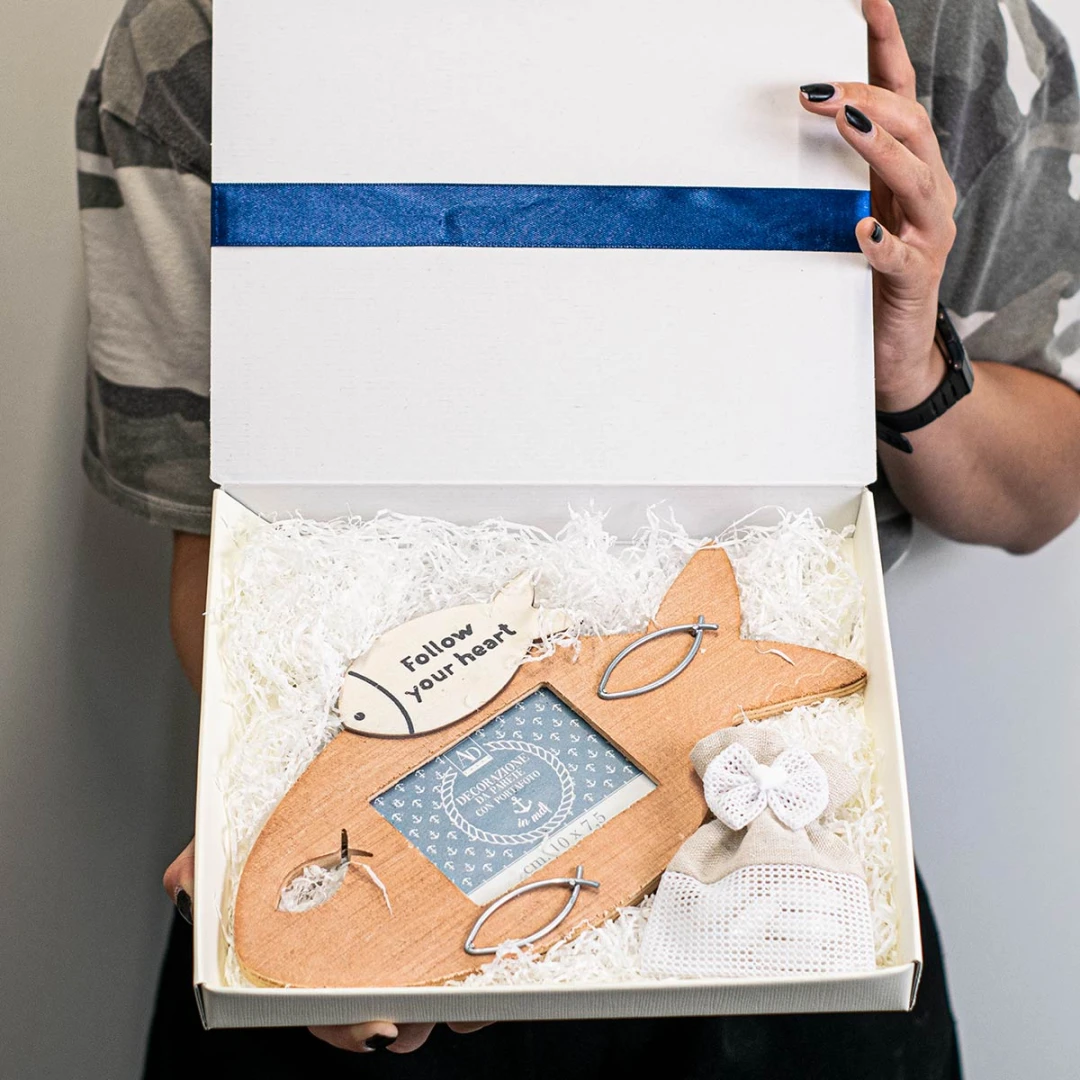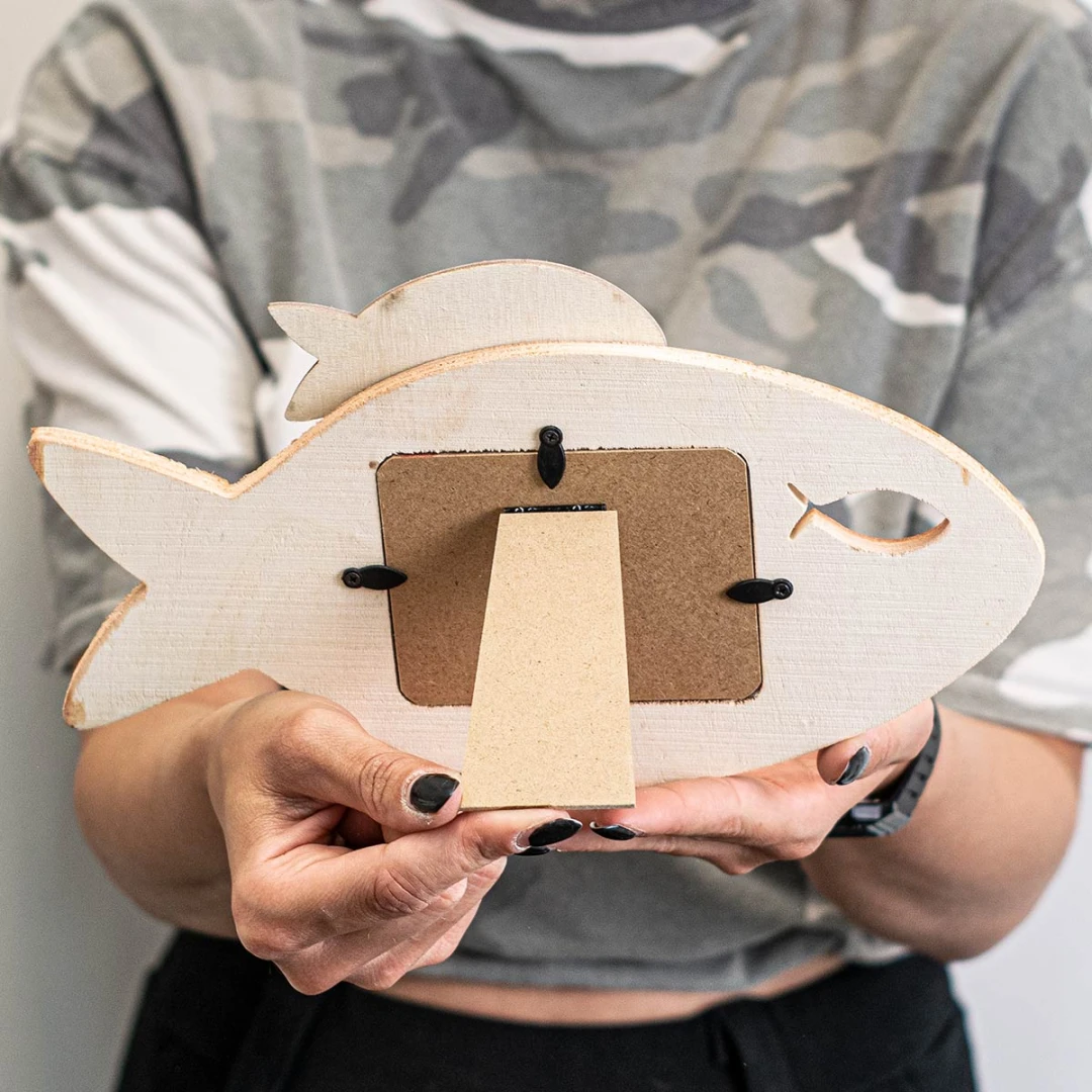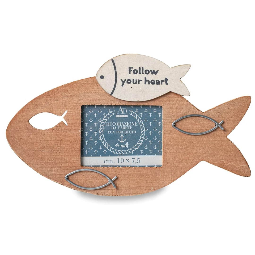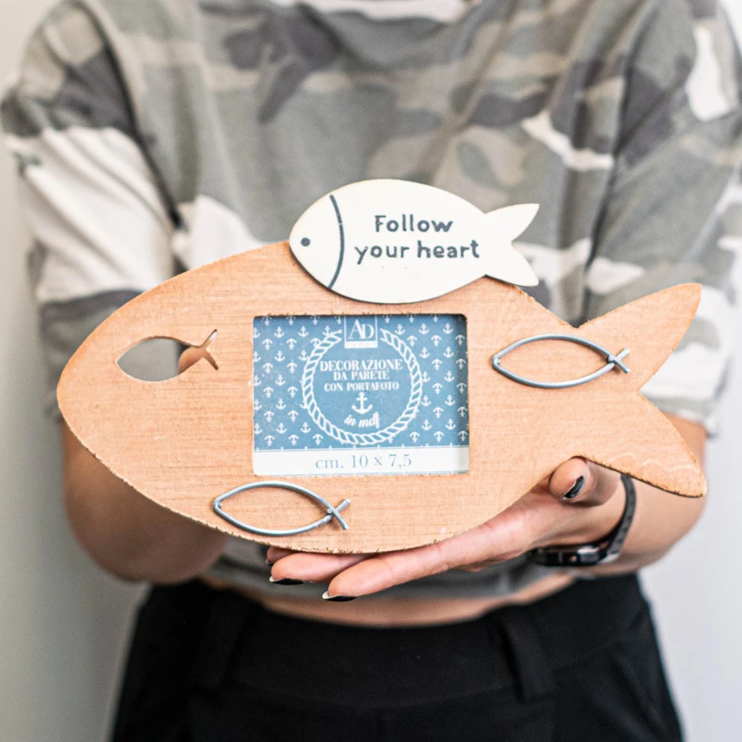 Bomboniere originali ed economiche, portafoto da appoggio in legno decorato a mano con applicazioni pesciolini, articolo di tendenza 2026. misura 27x15 cm