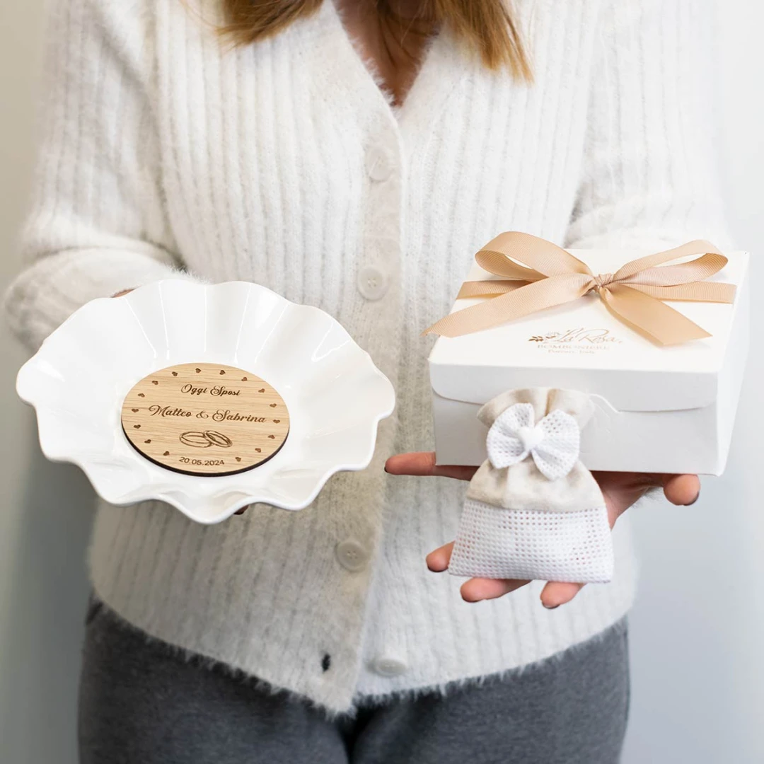 Bomboniere originali 2026, piatto svuota tasche in ceramica bianca con centro in legno e incisione personalizzata con nomi e data, misura 19x19x4 cm
