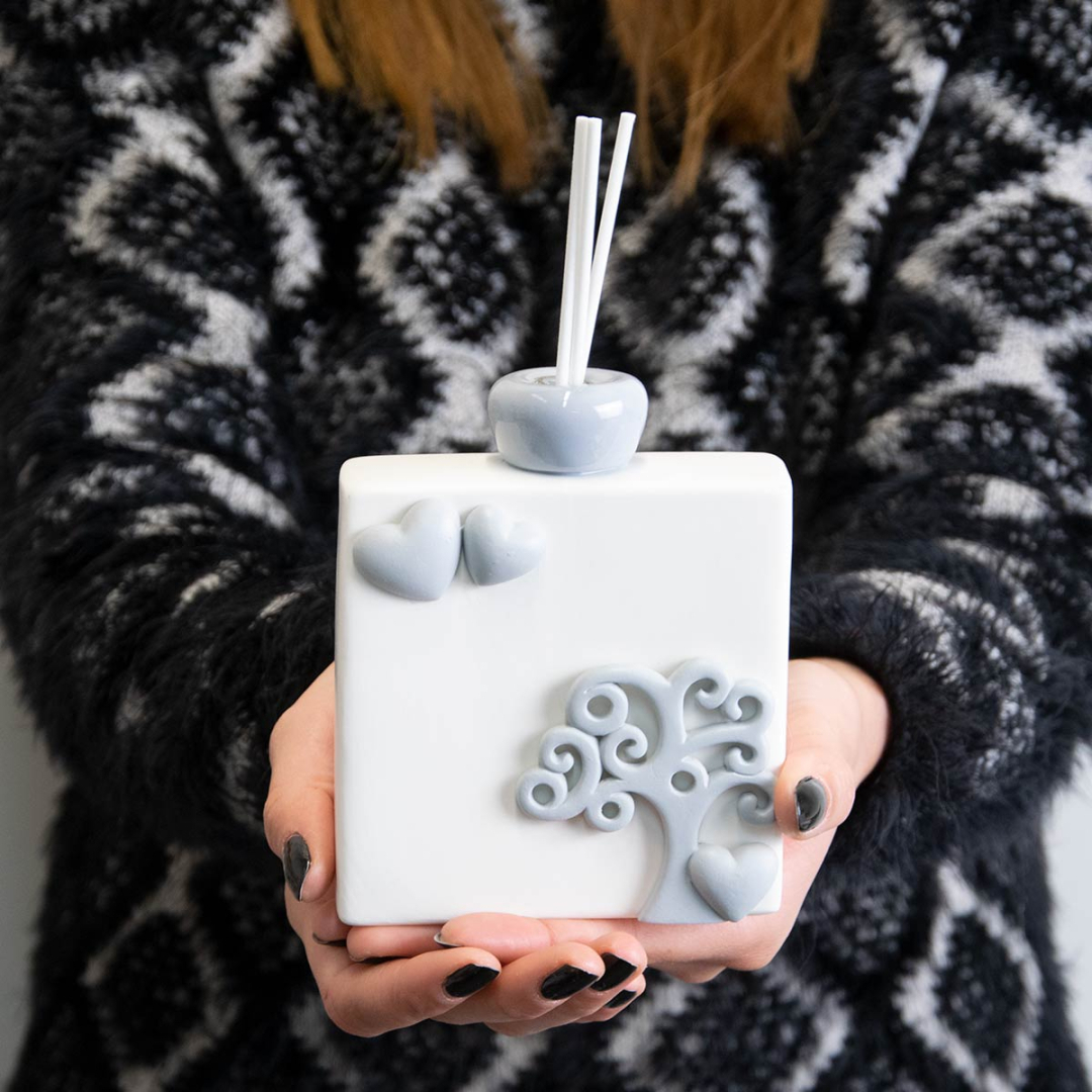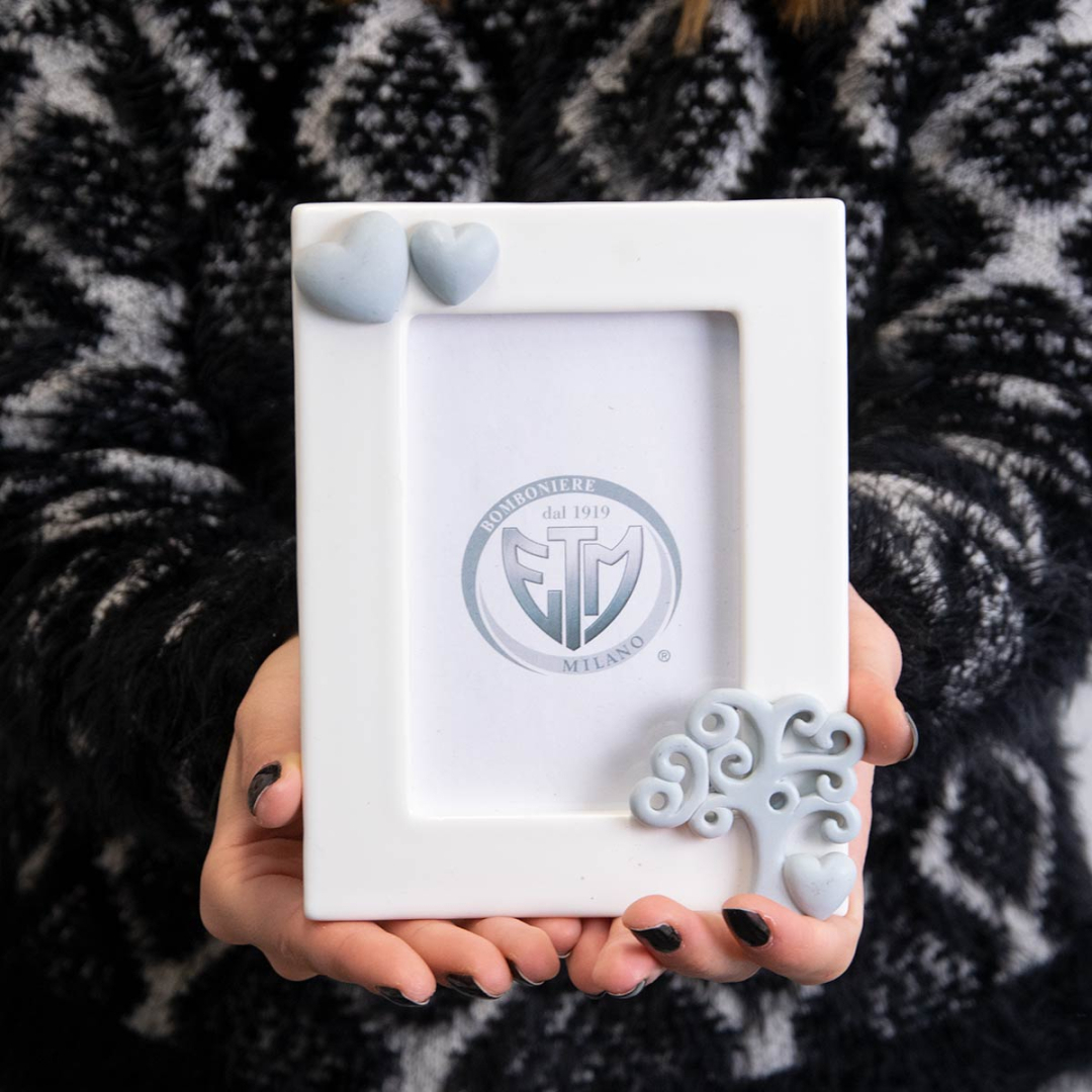 Bomboniere linea albero carta da zucchero in OFFERTISSIMA, composta da Portafoto, Portapiantina, Orologio e Profumatore in ceramica bianca e Albero della Vita colore carta da zucchero. La scatola è sempre compresa, tranne per il portapiantina.