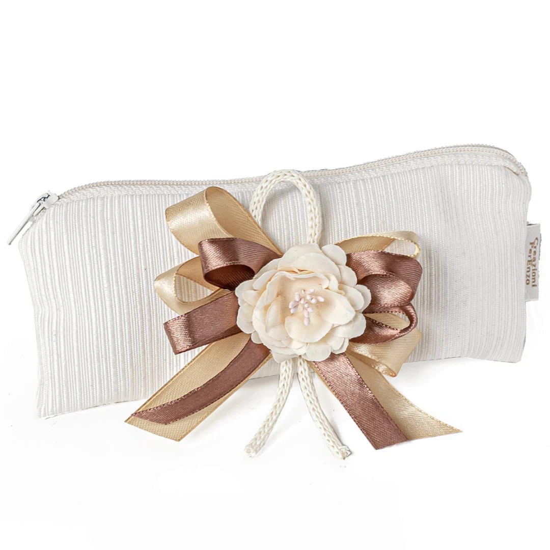 Sacchetto portaconfetti a forma di busta con zip, articolo artigianale Made in Italy di alta qualità, completo di nastri, misura 16x7 cm