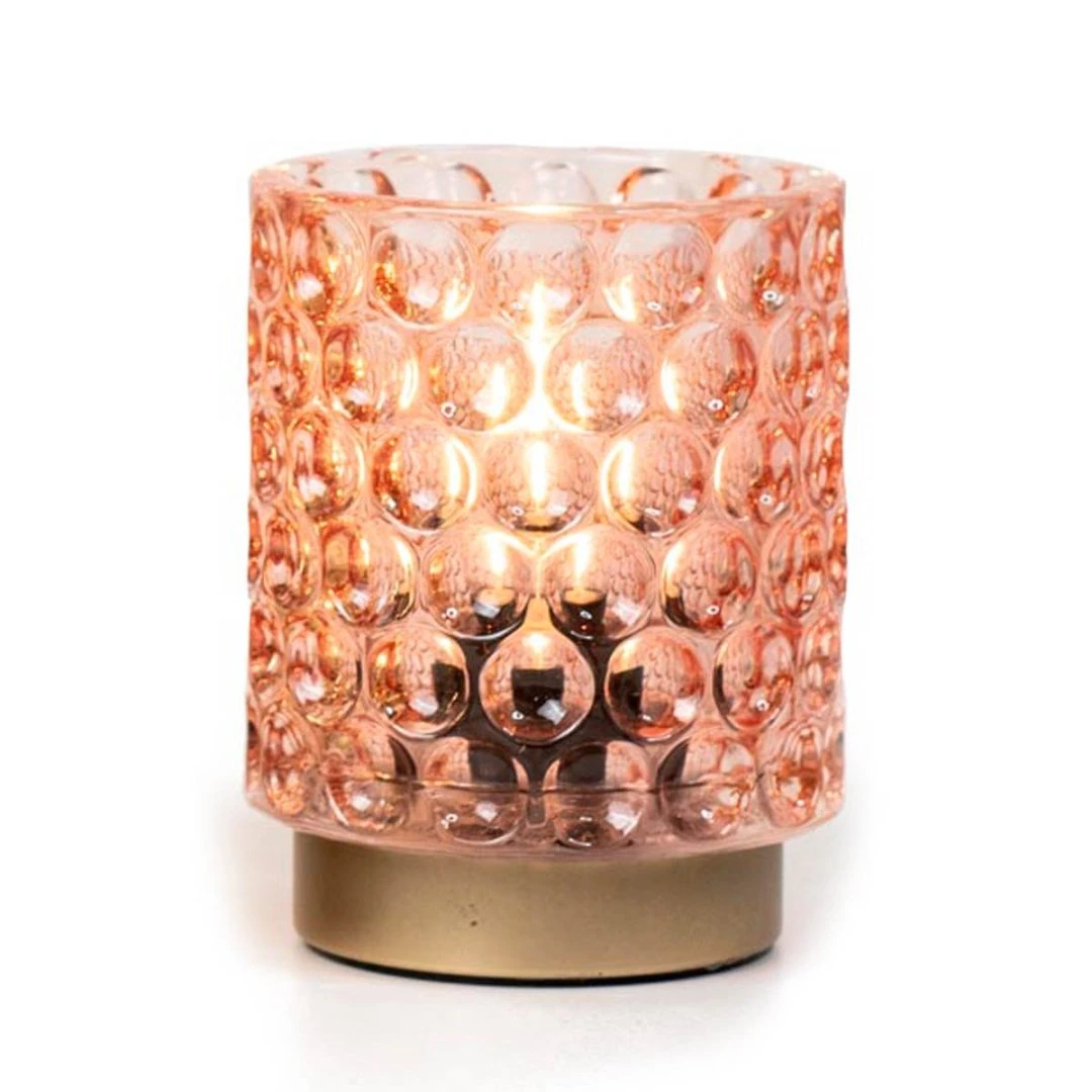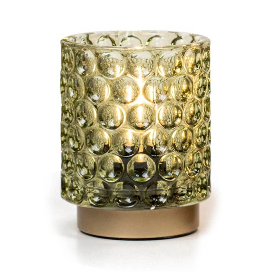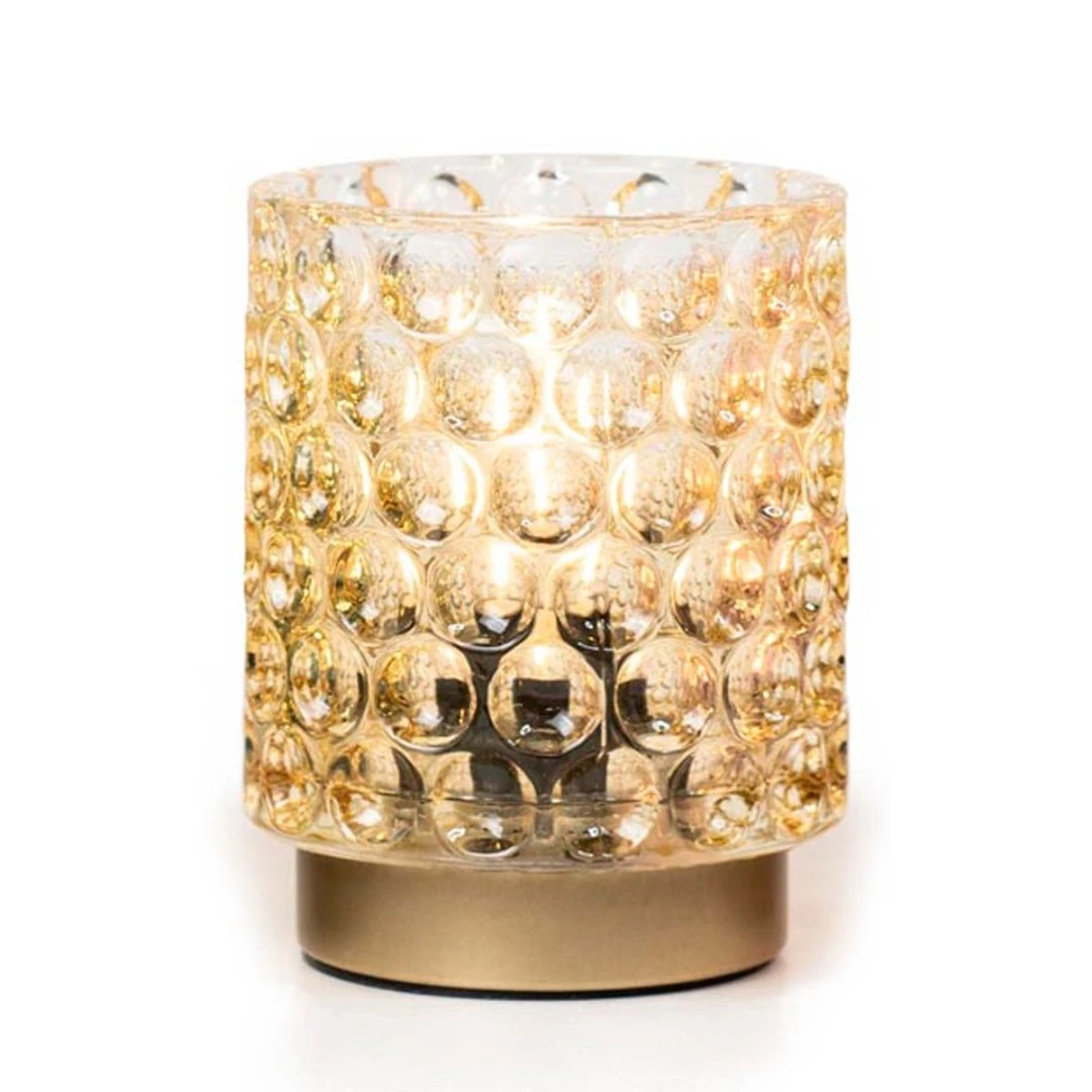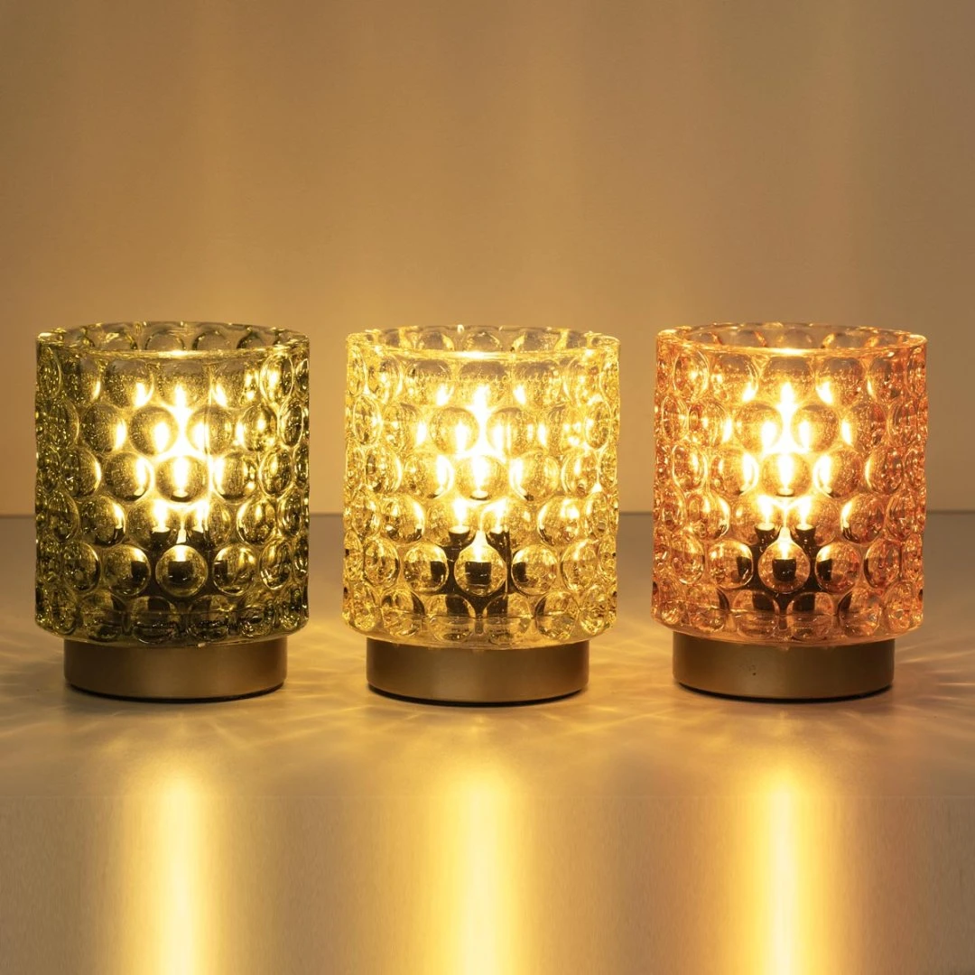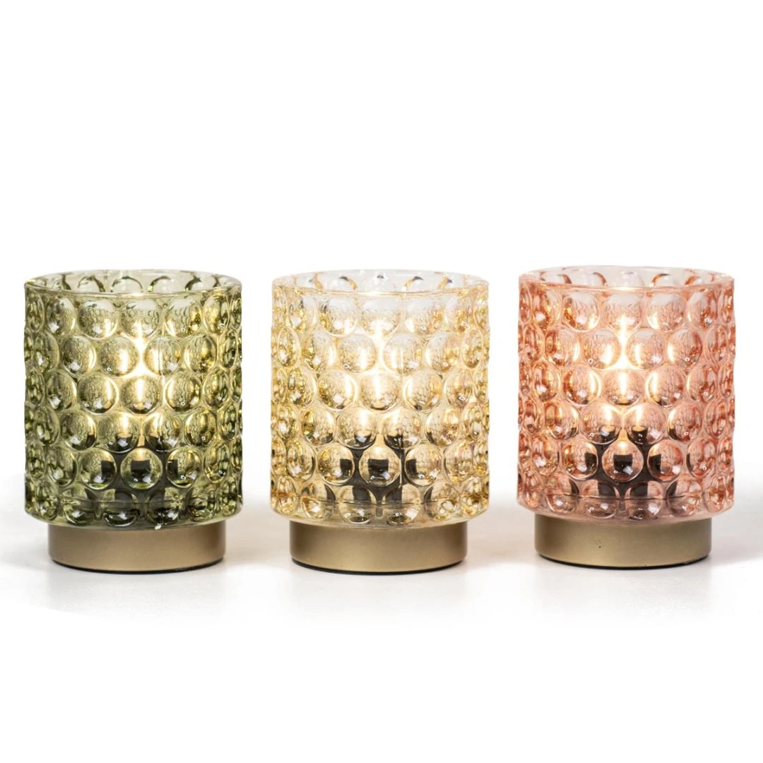 Il vetro è lavorato con una texture a rilievo che crea suggestivi giochi di luce, mentre la base metallizzata dona stabilità e un tocco moderno. Ideali per illuminare con atmosfera tavoli, angoli di casa e allestimenti per eventi.