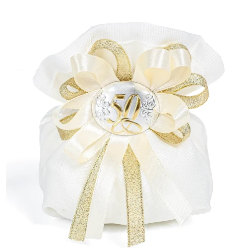 Sacchetti Portaconfetti per Nozze d'Oro 50 Anni Matrimonio in tessuto avorio con nastri dorati, prodotto nel nostro laboratorio, made in Tuscany. misura 9 cm