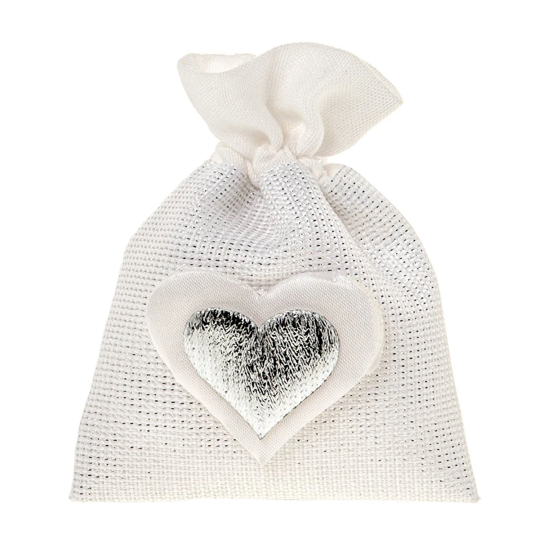 Bellissime Bomboniere Nozze d'Argento 2026, Linea Heart, Sacchettini Portaconfetti argentati con cuore argento. Prezzo cadauno. Prodotto Artigianale. Misura: 8 x 10 cm.
