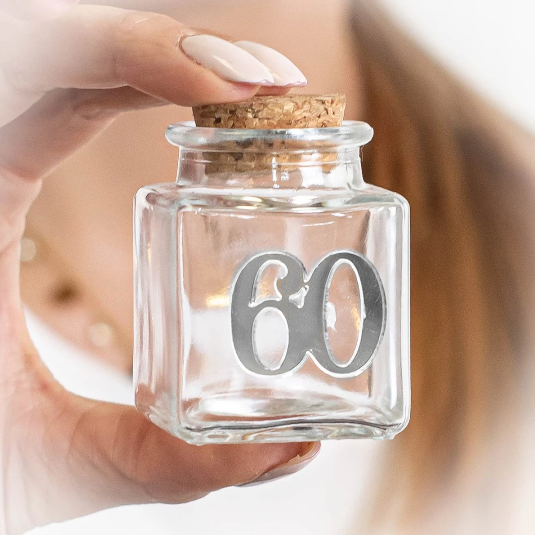 Bomboniere Nozze di Diamante, Barattolino in vetro portaconfetti numero 60 in plexiglass argento, misura 5 cm.