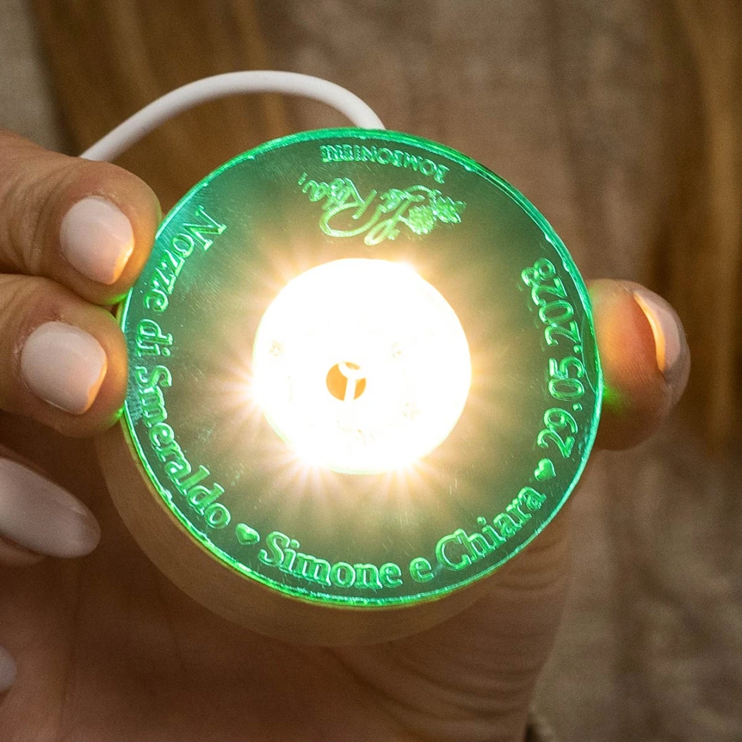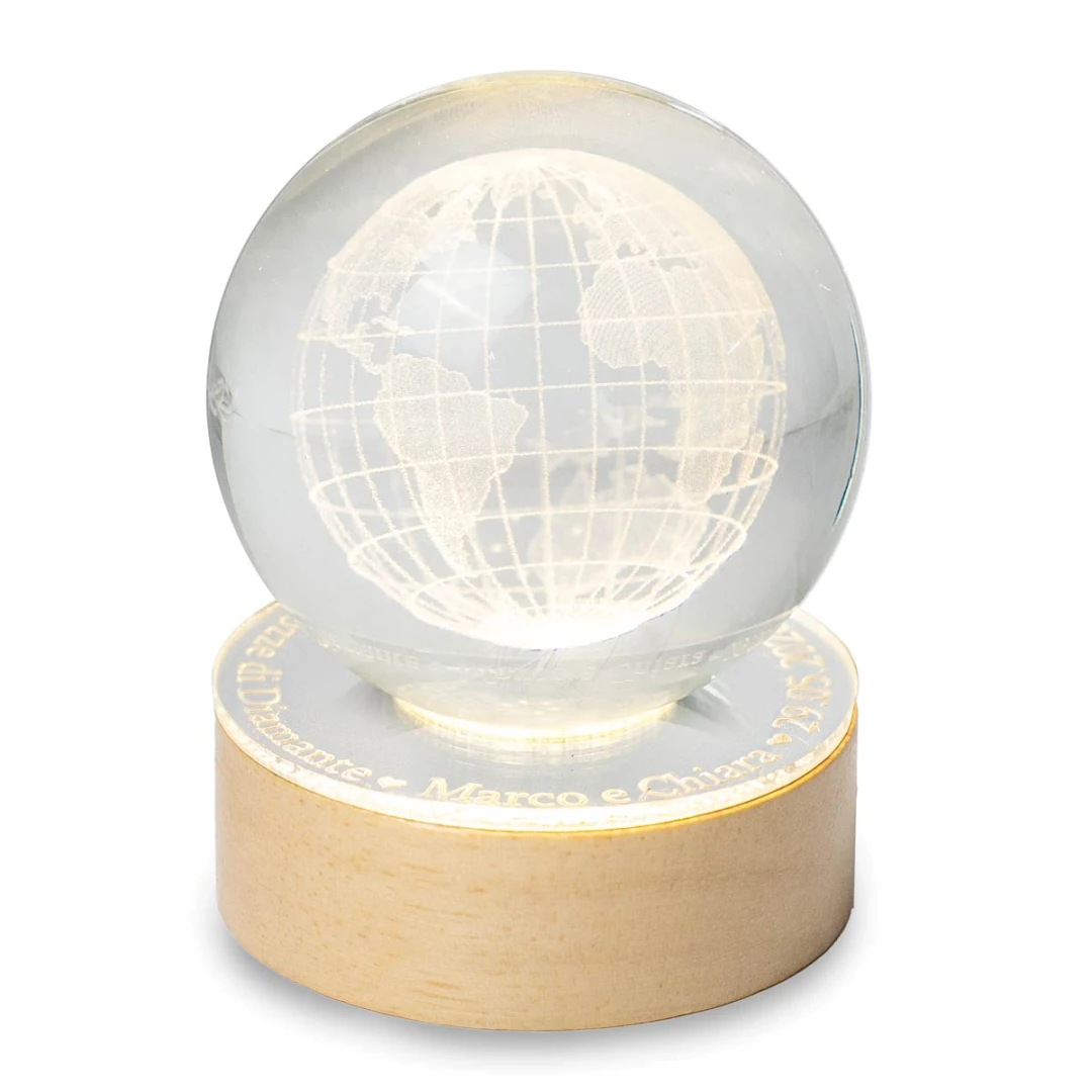 Bellissime Bomboniere Matrimonio 2026, Sfera in vetro con grafica in 3D, (si vede da tutti i lati) su base in legno a LED e con possibilità di personalizzarla su base in plexiglass a specchio. Prodotto Artigianale. Misura: Ø 6 cm | h 9 cm.