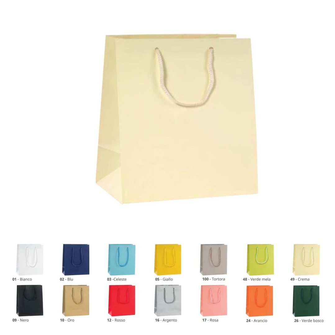 Shopper in cartoncino plastificato versione qualità, completo di cordine abbinate misura 16x8 alta 19 cm, ideale per confezionare bomboniere e regali
