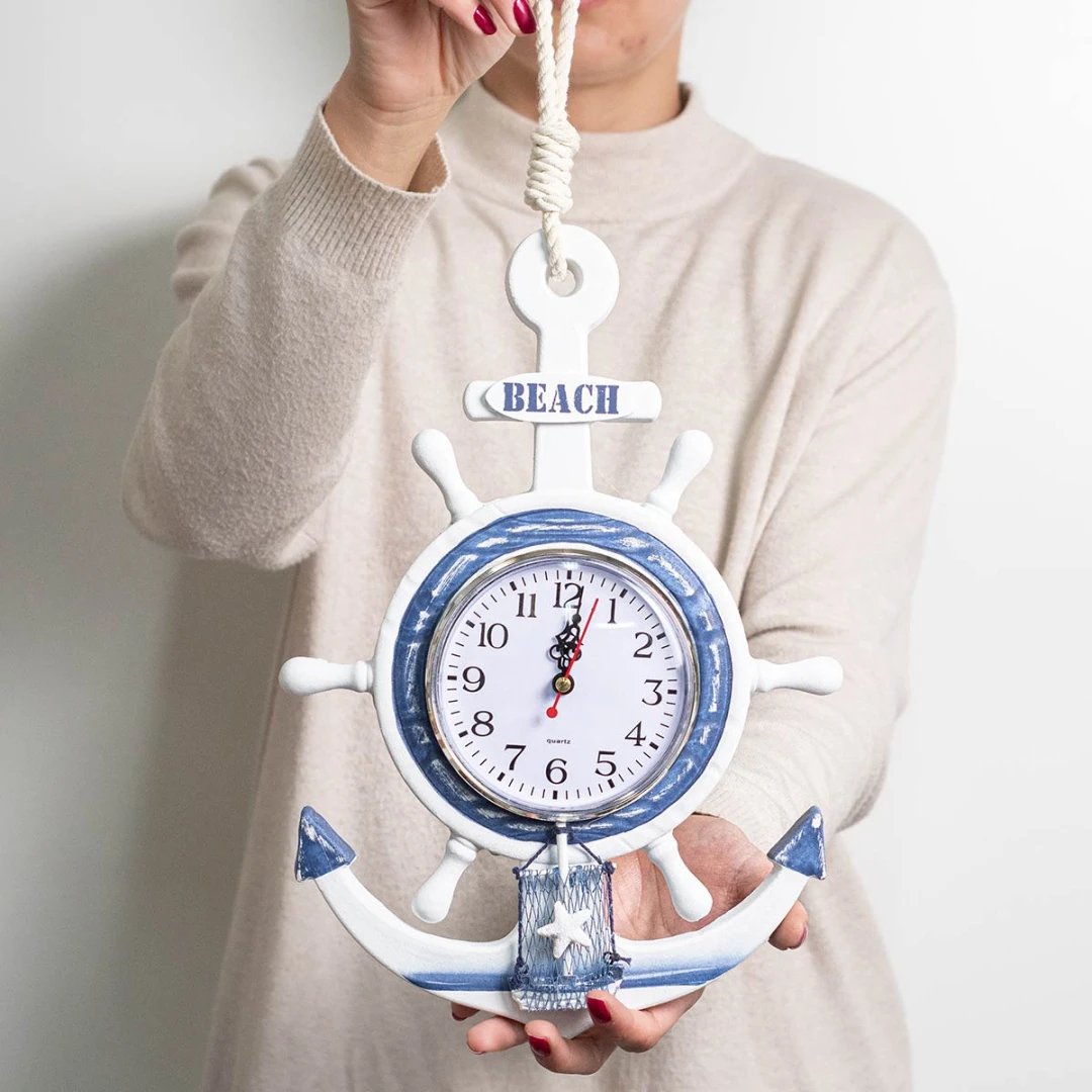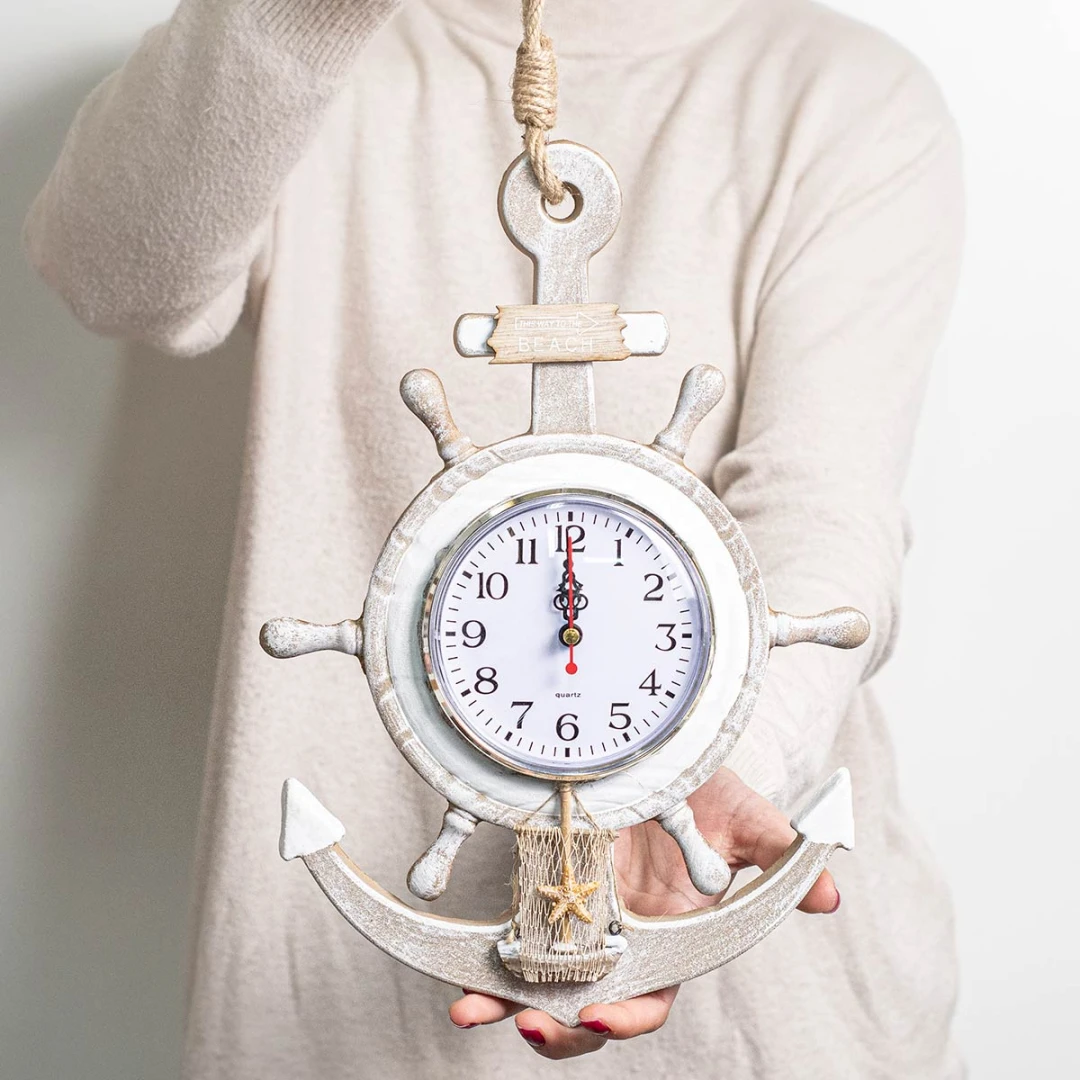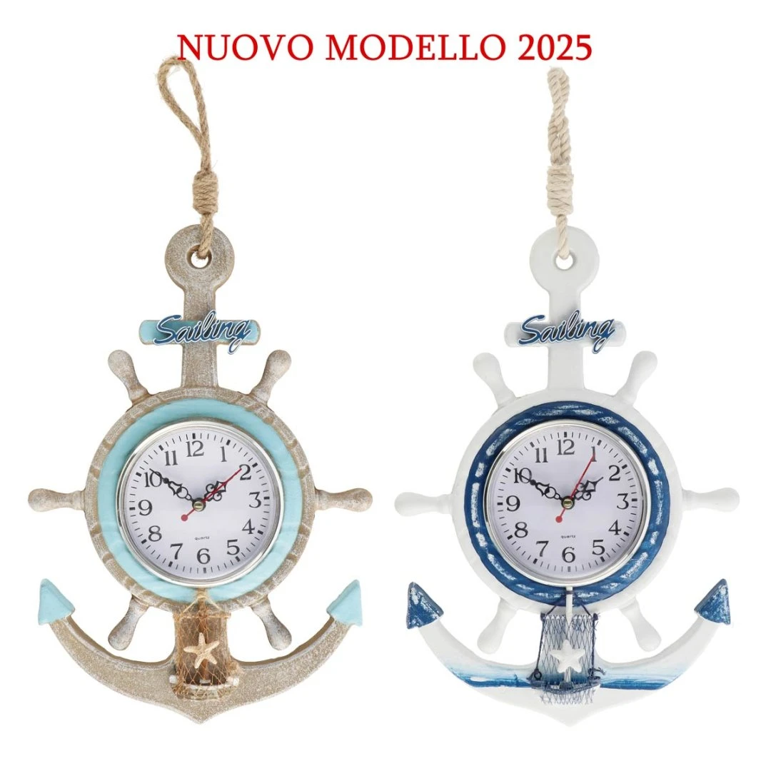 Bomboniere originali tema mare ed economiche, Orologio da appendere in legno decorato a mano con applicazione scritta "Beach" e stella marina, misto in due colorazioni (Blu/Bianco e Beige/Bianco), prezzo cadauno, articolo di tendenza 2026. misura 45 x 23 cmti arriverà il nuovo modello 2026 vedi foto