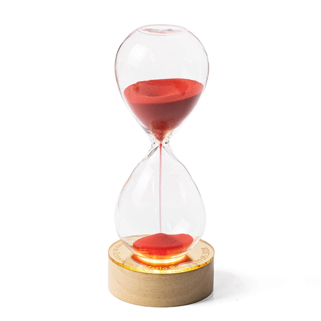 Bellissime Bomboniere Santo Battesimo Femmina 2026, Clessidra in vetro soffiato, su base in legno a LED e con possibilità di personalizzarla su base in plexiglass a specchio. Prodotto Artigianale. Misura: h 13 cm. Sabbia disponibile in diversi colori.