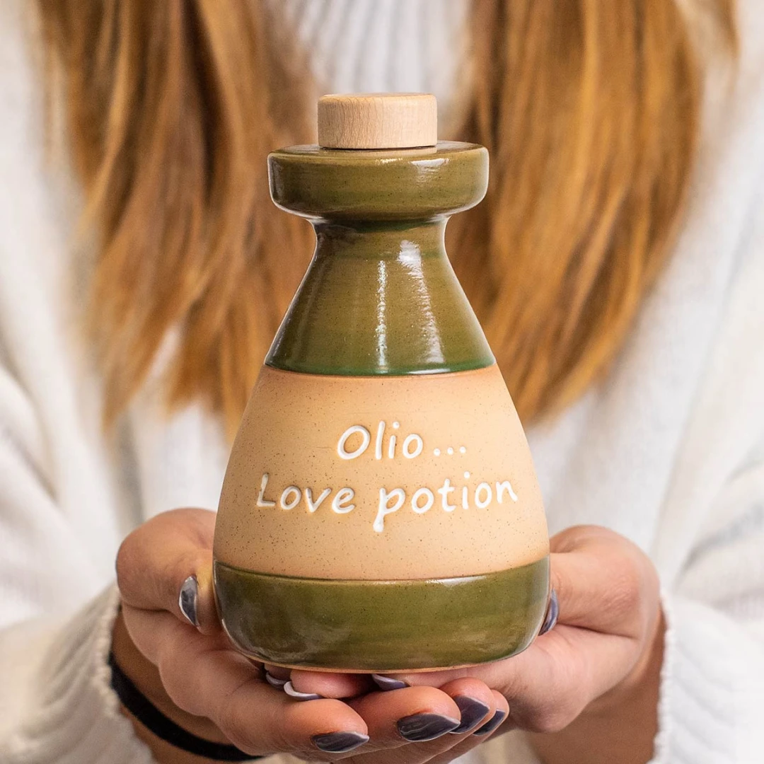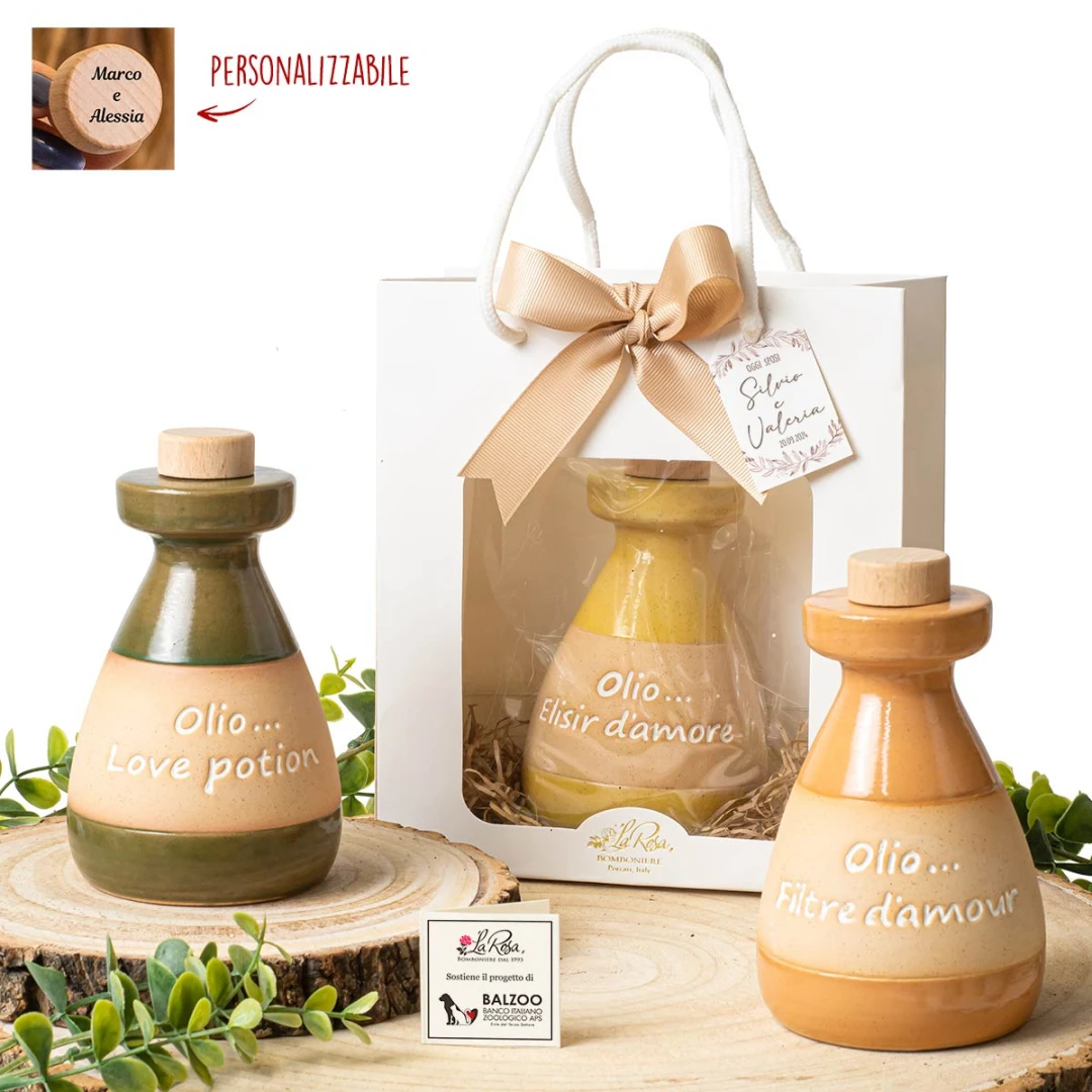 Bellissime Bomboniere 2026 Linea ULIVO, Oliera in porcellana con frasi e tappo in legno. Misura: 8,5 x 14 cm. Arrivano assortiti in 3 decori e colori differenti (Giallo, Arancione e Verde). Prezzo cadauno. Prodotto Artigianale.