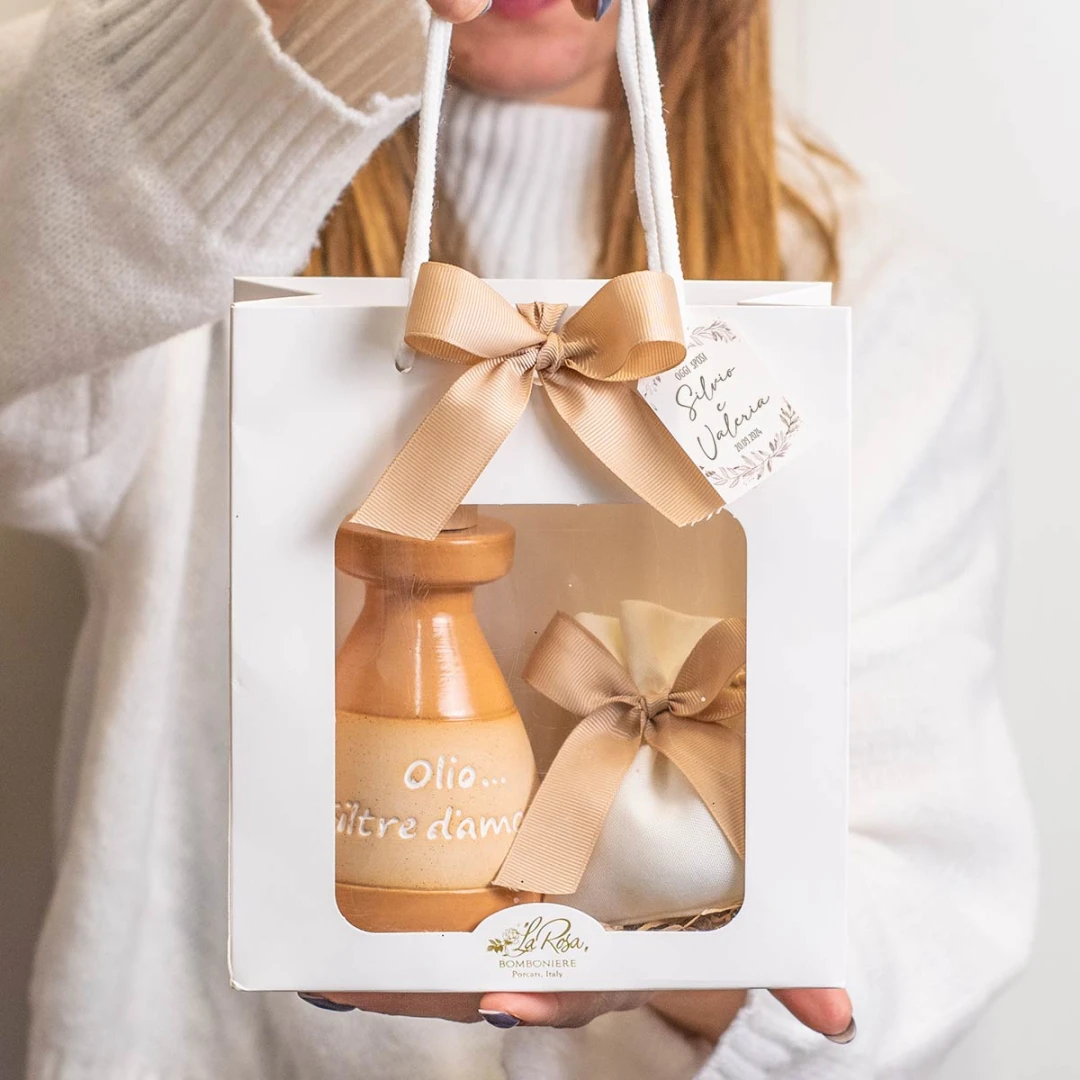 Riceverai la tua bomboniera confezionata con cura dal nostro laboratorio, pronta per essere donata, completa di