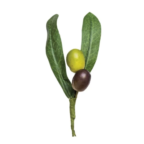 rametto di ulivo pick finti per decorare bomboniere fai da te a tema olio, composto da 2 foglie di ulivo, 2 olive, e ramo con anima in ferro. misura 13 cm, olive 2,5 cm.