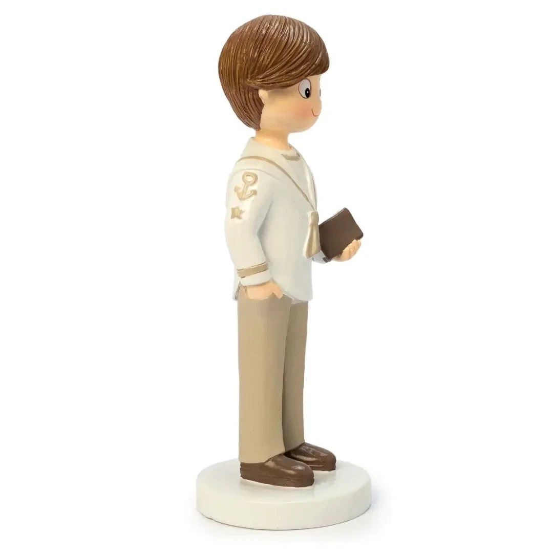Il Cake Topper Bambino con bibbia vestito di beigie è perfetto per una comunione e cresima da maschio, rifinisci la torta del tuo bambino con un oggetto di qualità.