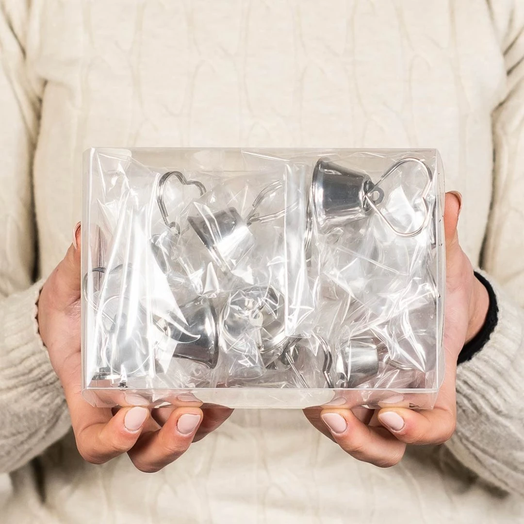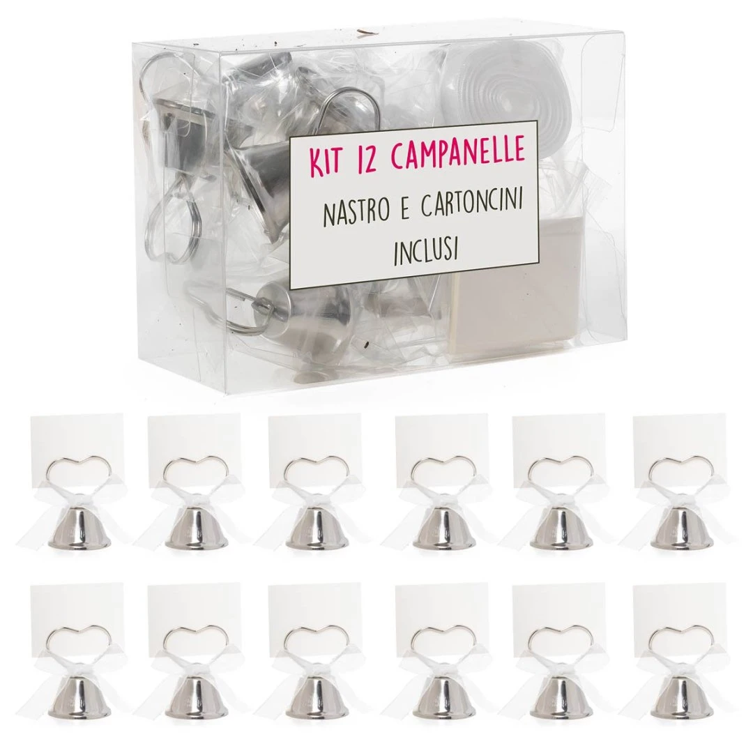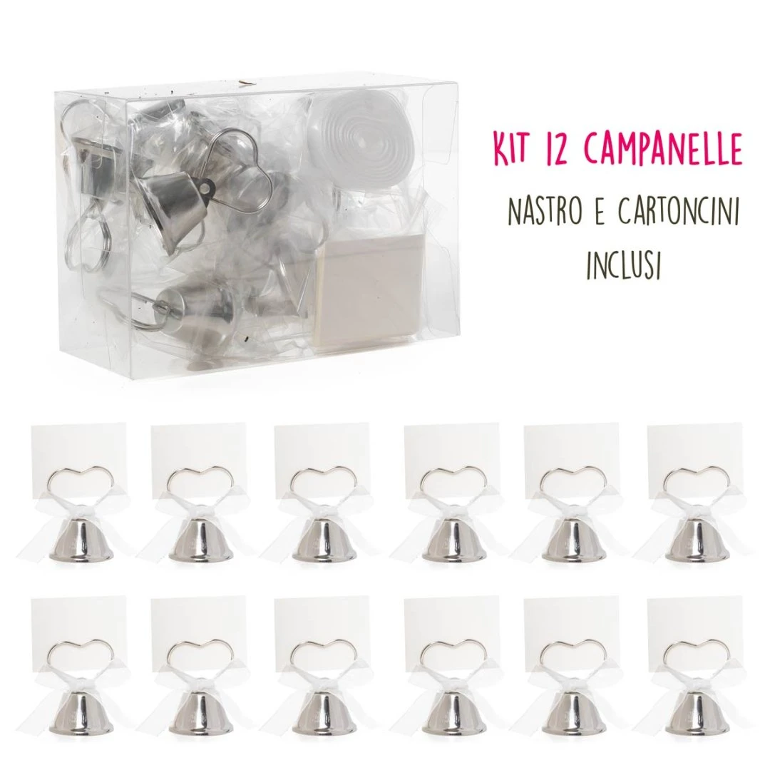 Kit da 12 campanelle tirabaci matrimonio color argento con 12 cartoncini portabiglietto e rotolino di nastro inclusi. Perfette per coinvolgere gli invitati durante il taglio della torta o i momenti di festa. Campanella 3,5×3,5 cm (h 5 cm), cartoncino 5×4 cm, Vedi anche la campanella Oro